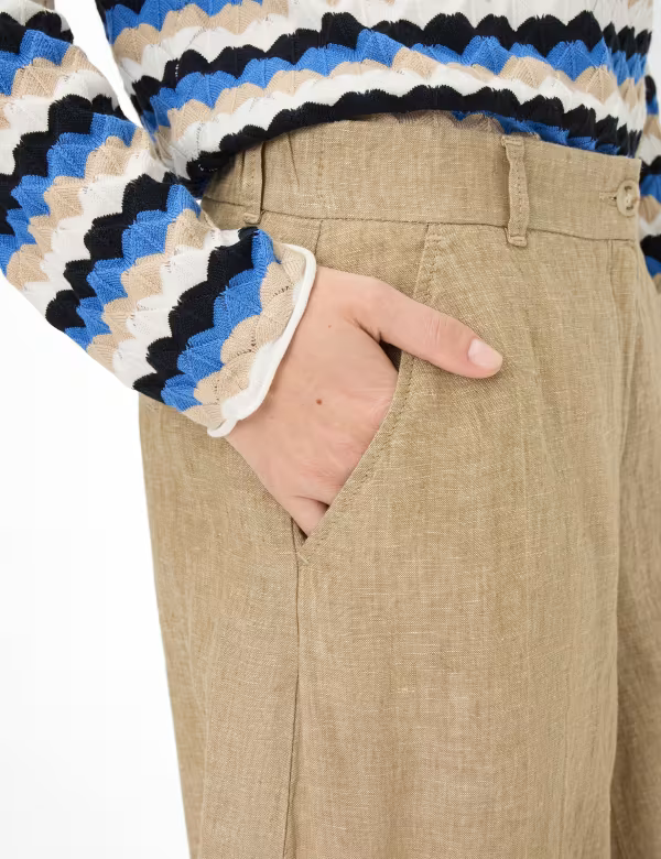 Calça estilo culotte 6/8, perna larga, cintura regular, bolsos embutidos.