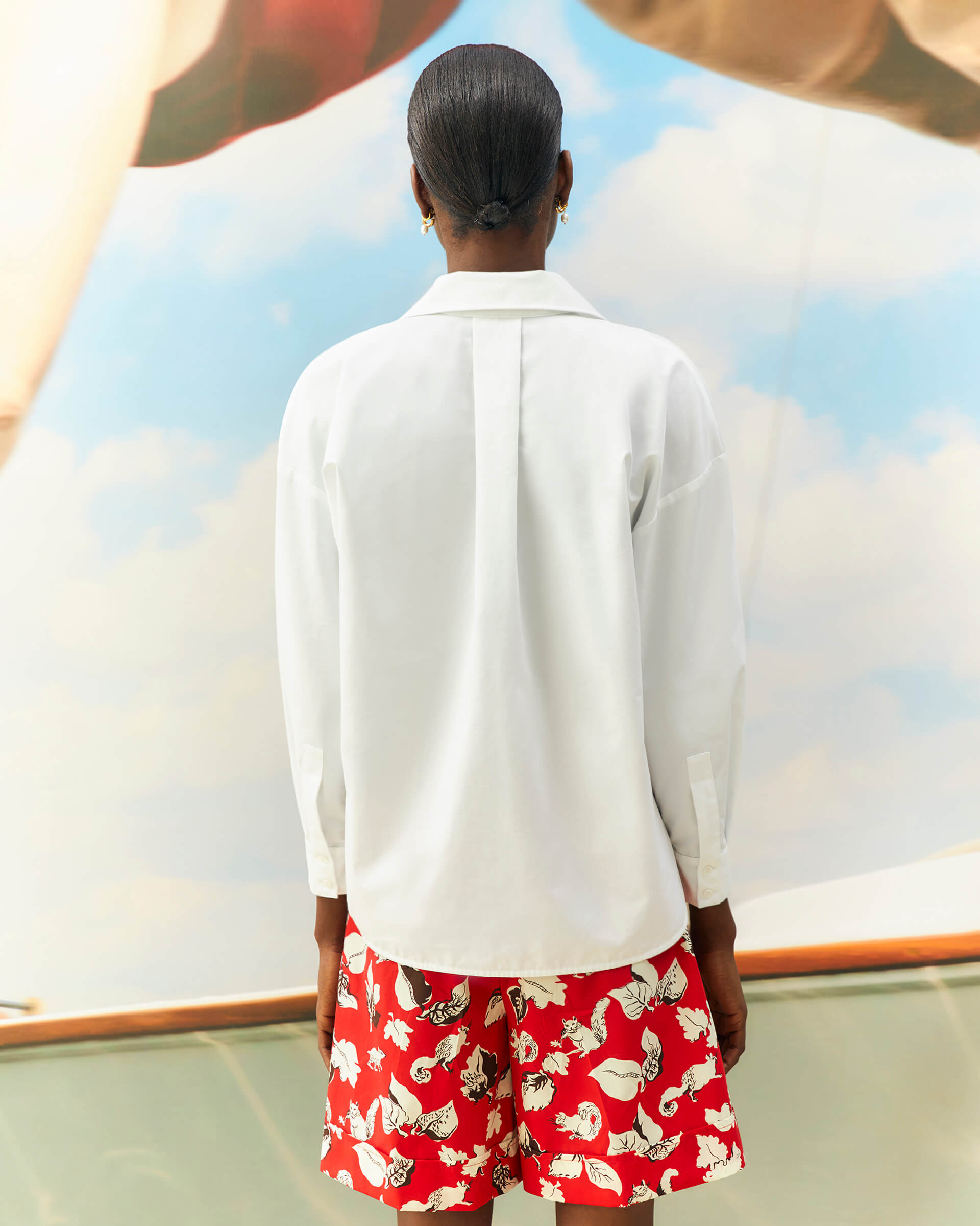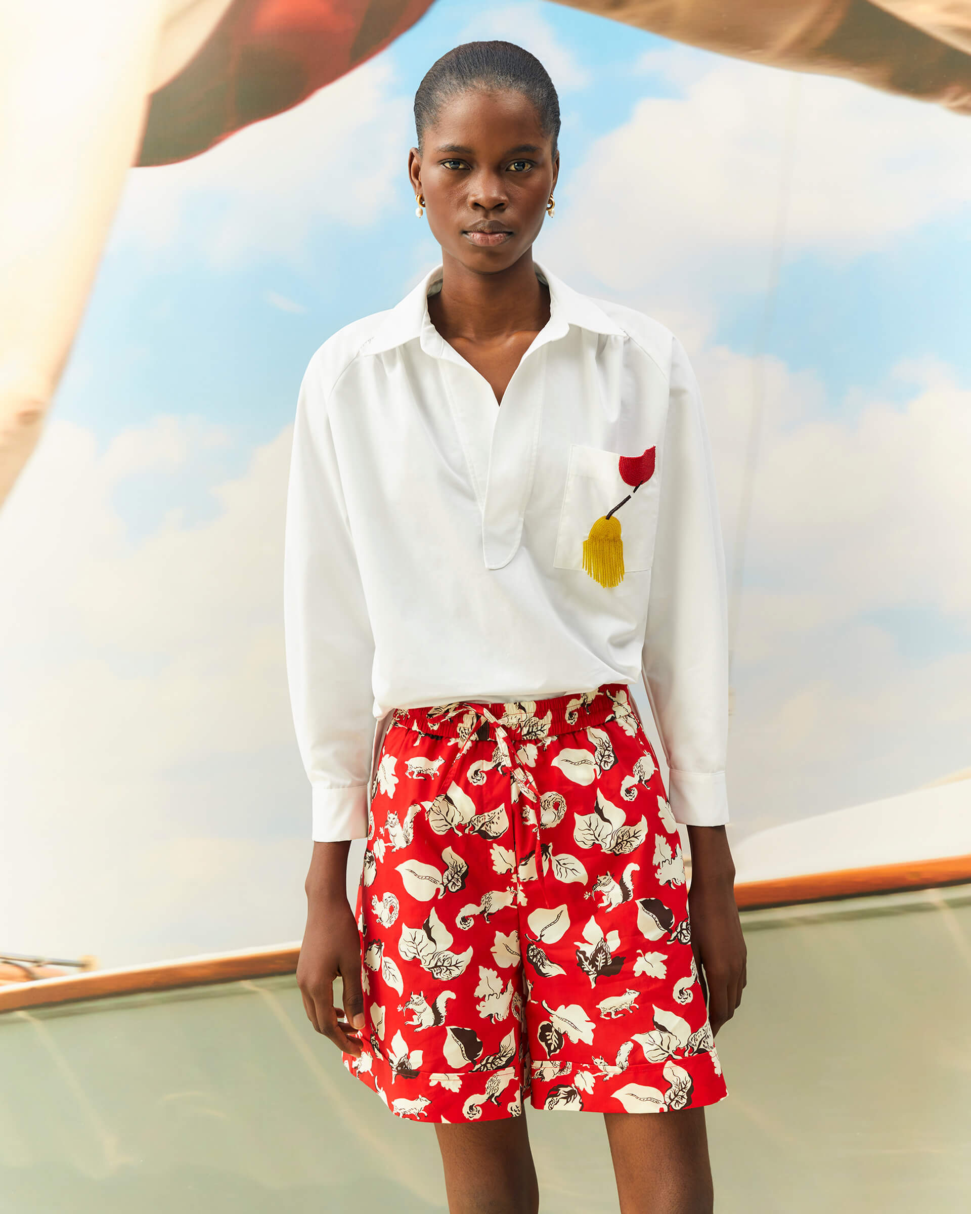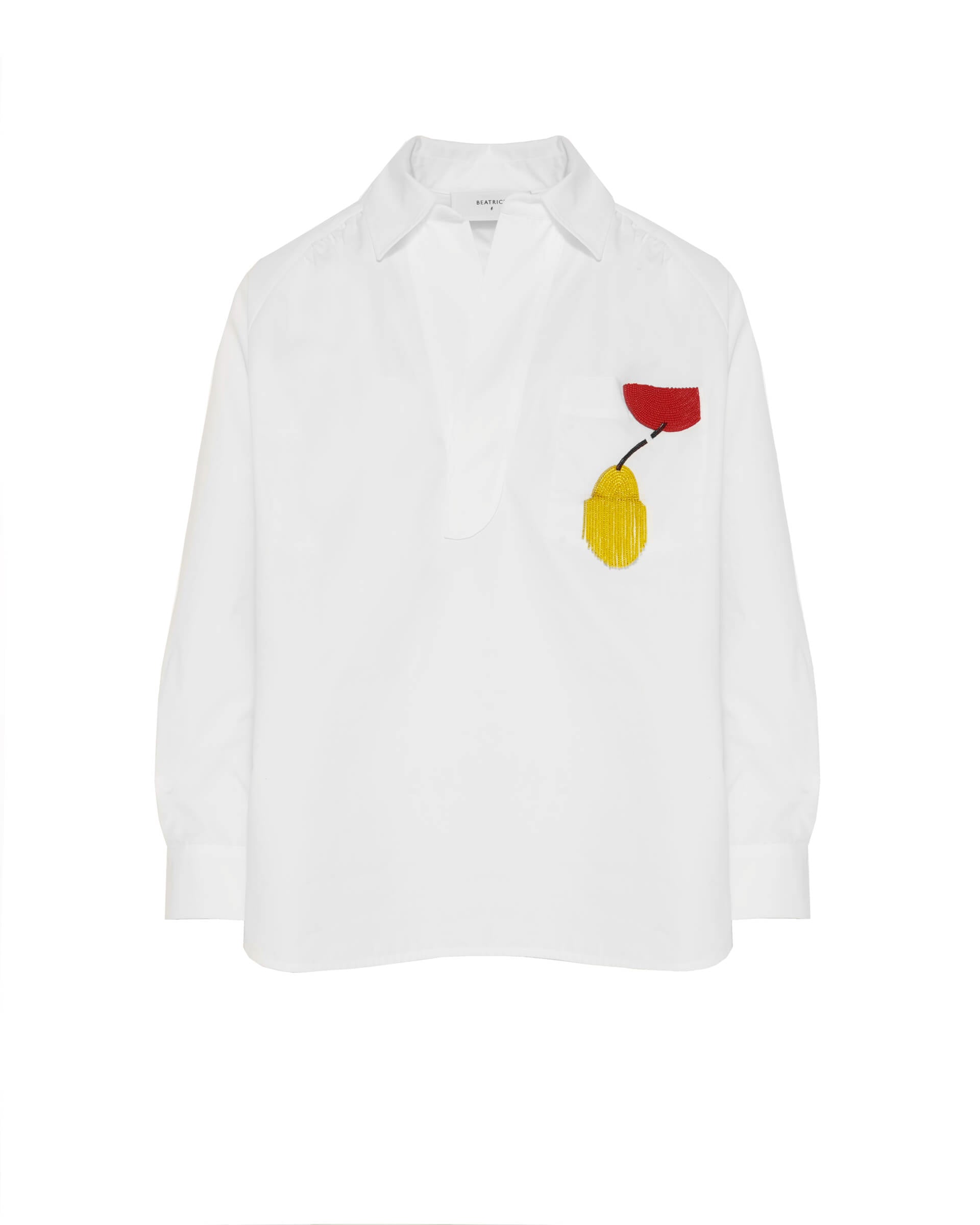 Camisa , com decote em forma de polo, manga 3/4, com pormenor de bolso bordado na frente em missanga.