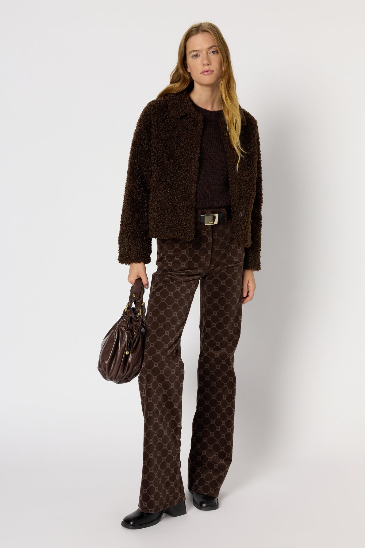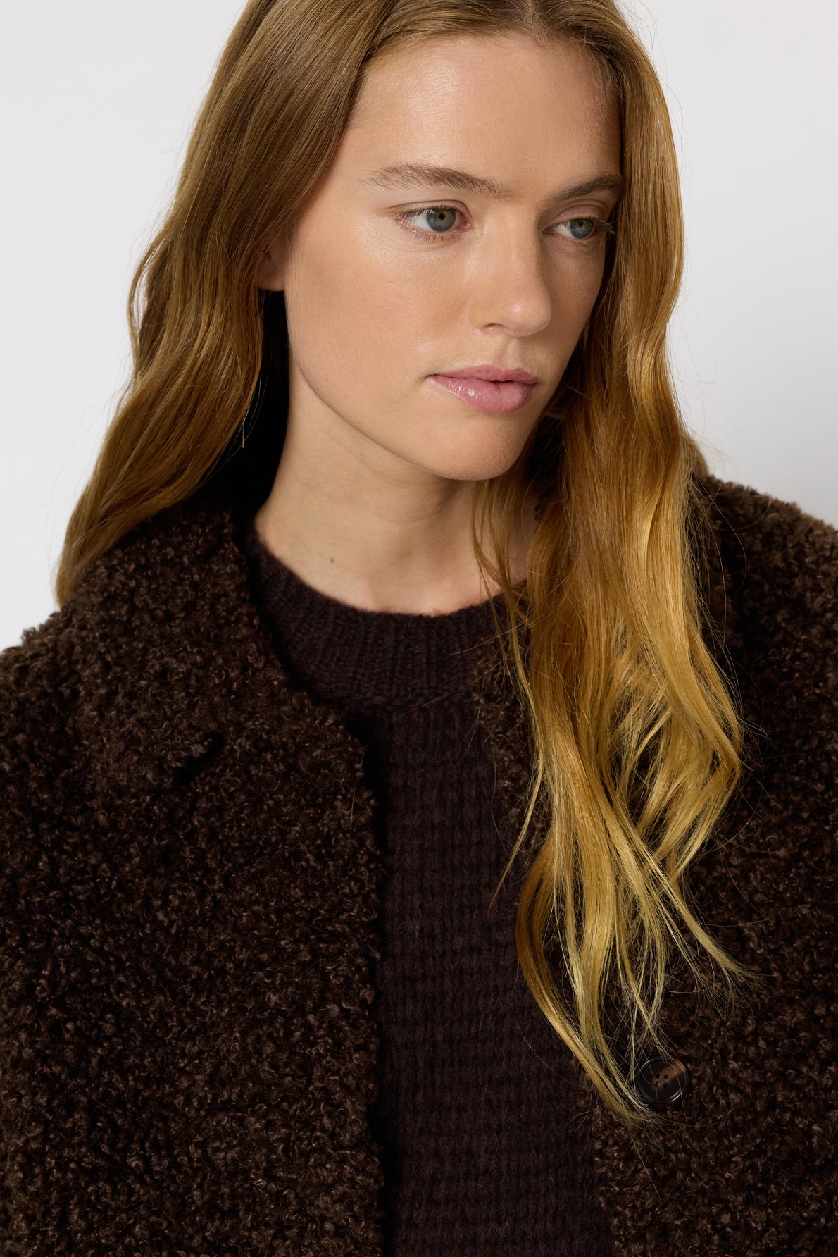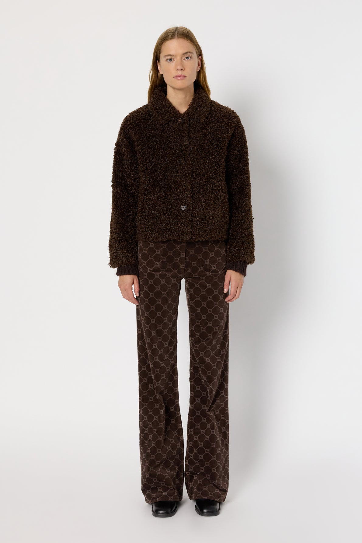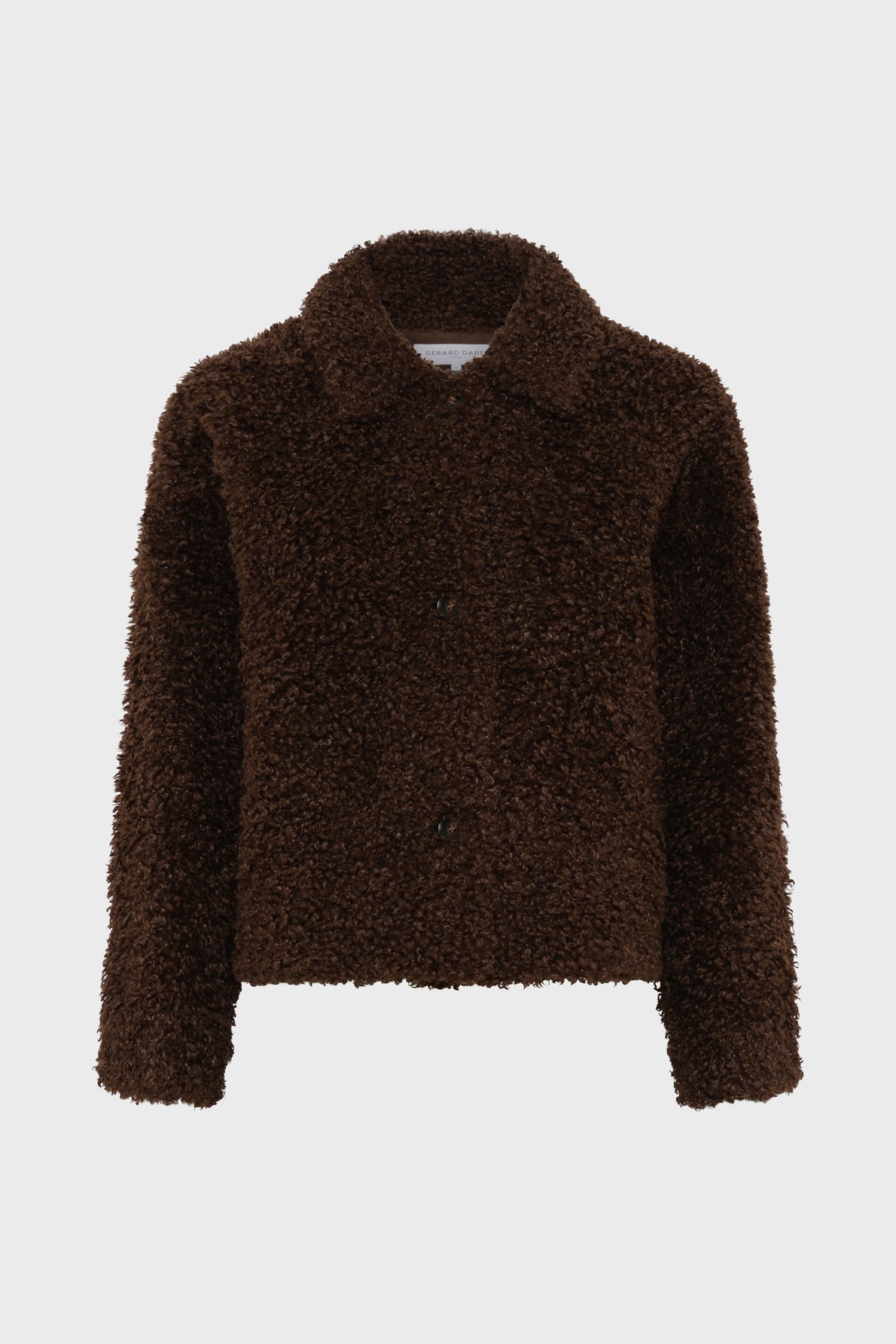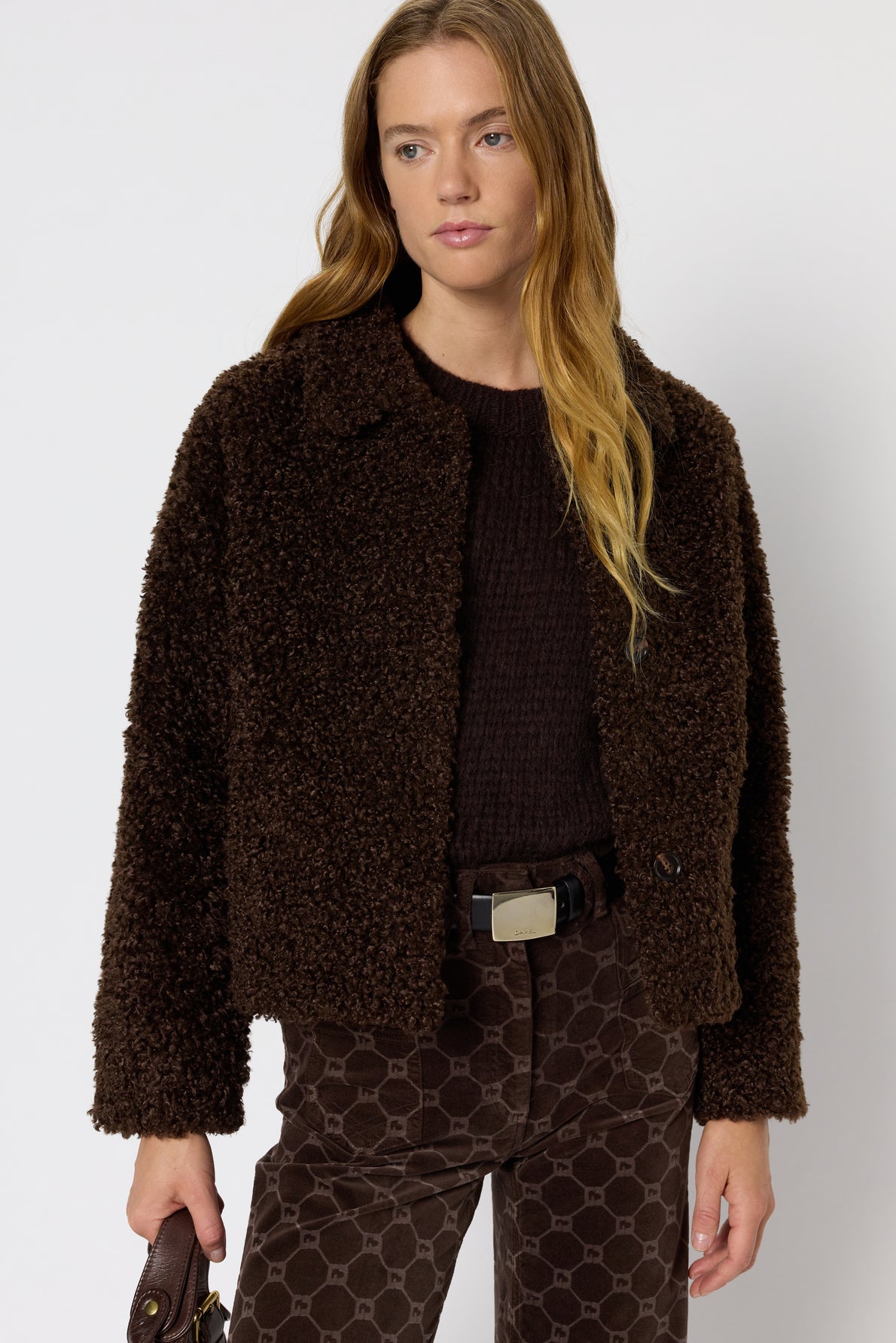 Casaco curto, em pele sintética, com textura bouclé , corte reto, gola de camisa e bolsos laterais.