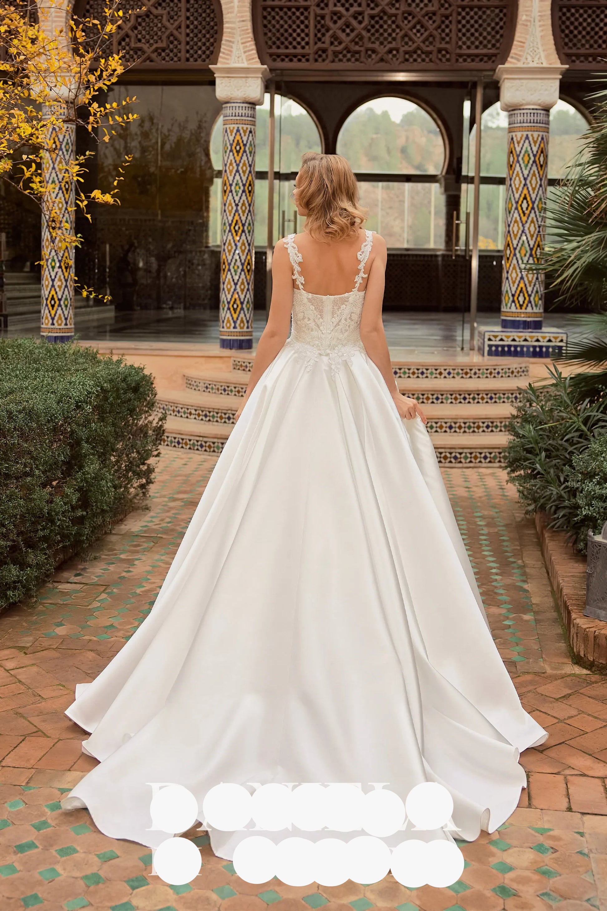 Saia com abertura profunda na frente, que combina com um corpete em renda e pedraria, decote em V e alça fina em renda com pormenor de pedraria.