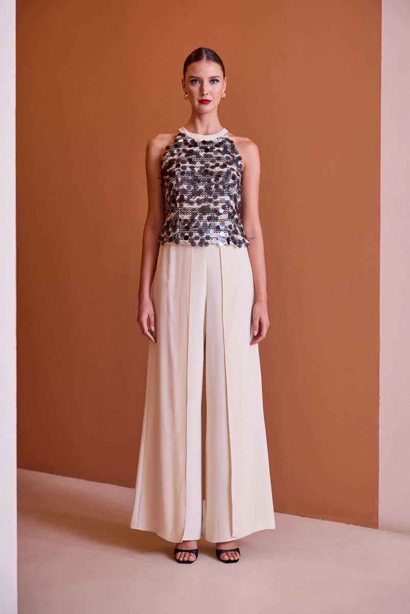 Calça fluída wide leg, top em lantejoulas, decote redondo e ombros nus.