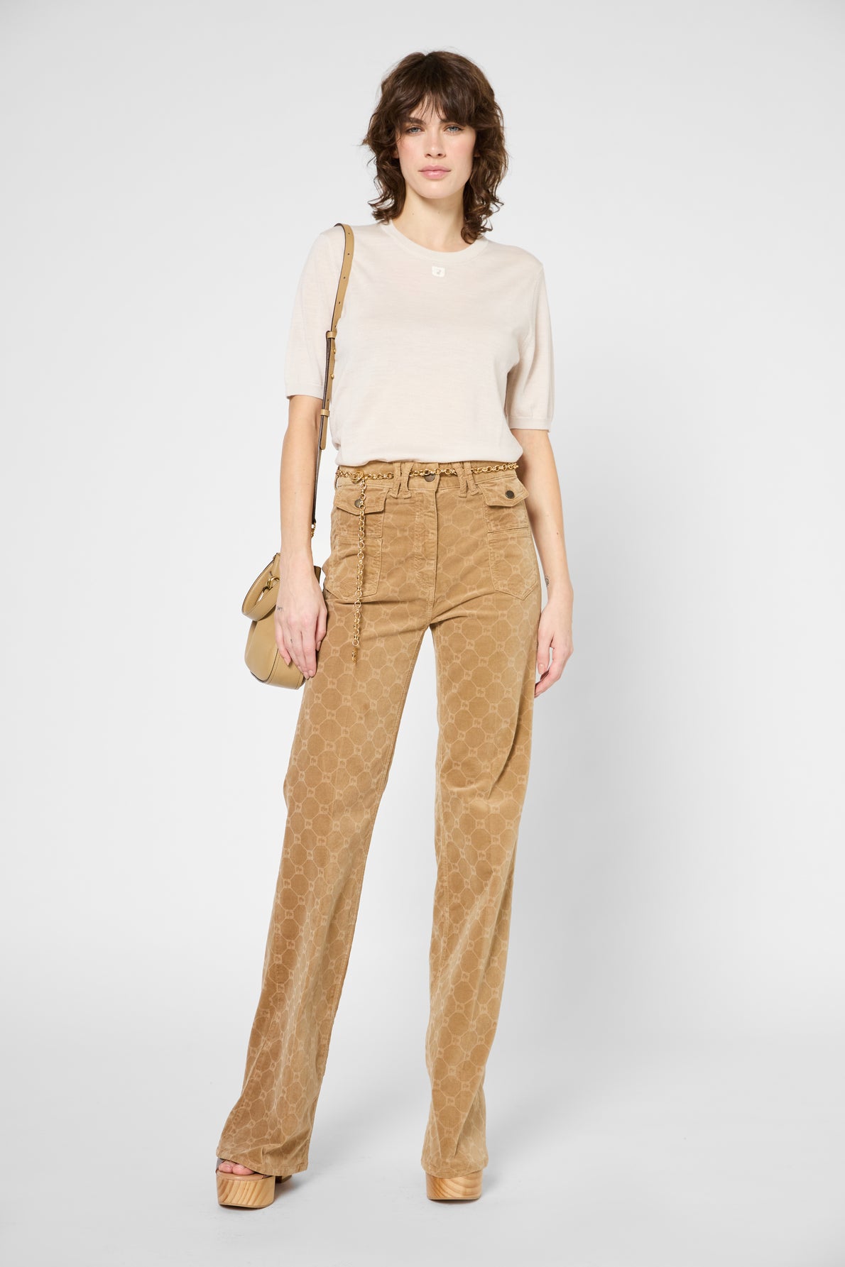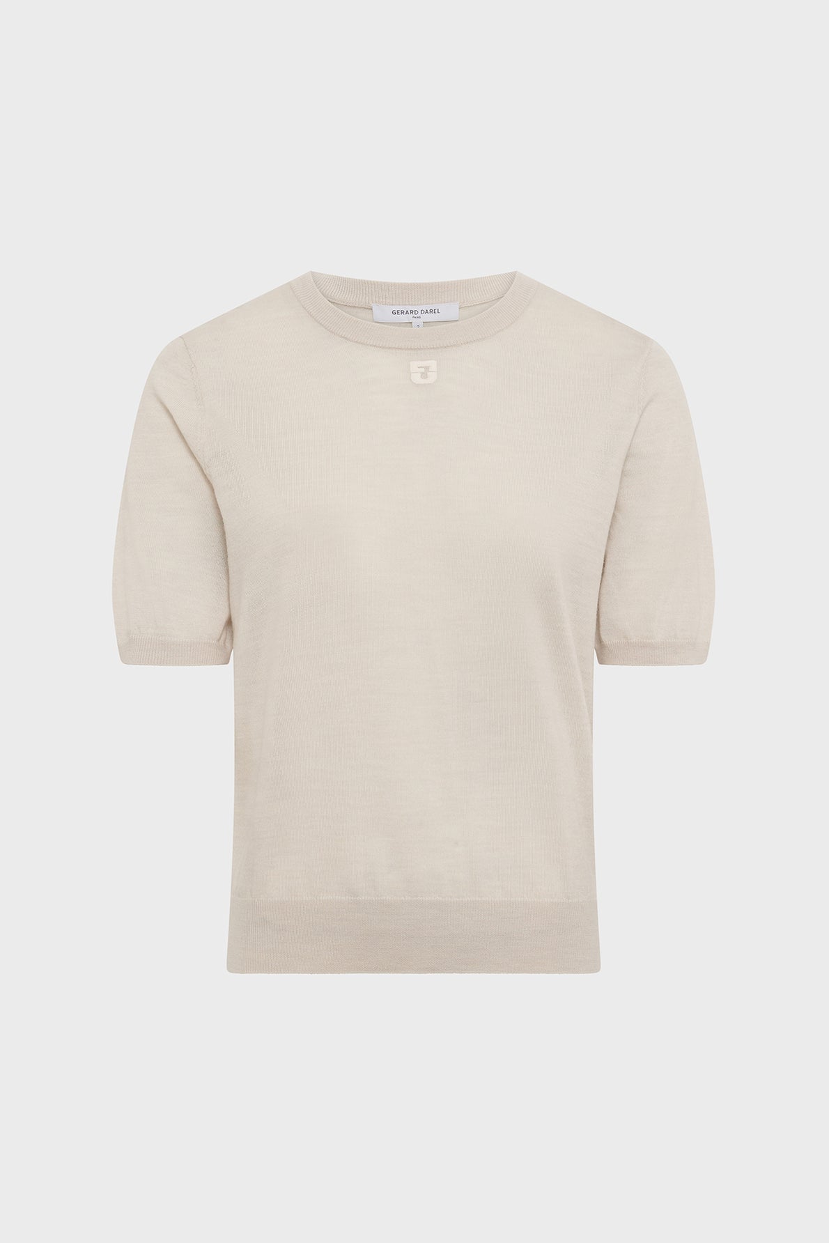 Malha em lã de merino, de corte reto, decote redondo e manga curta.