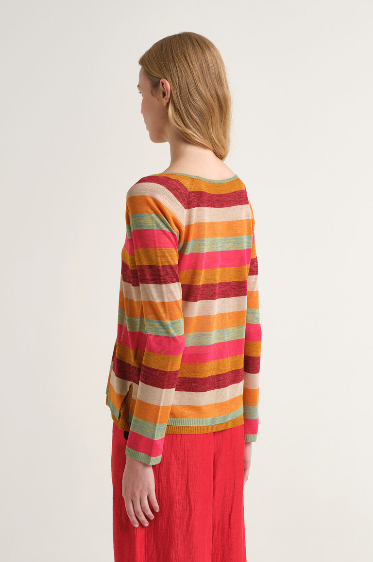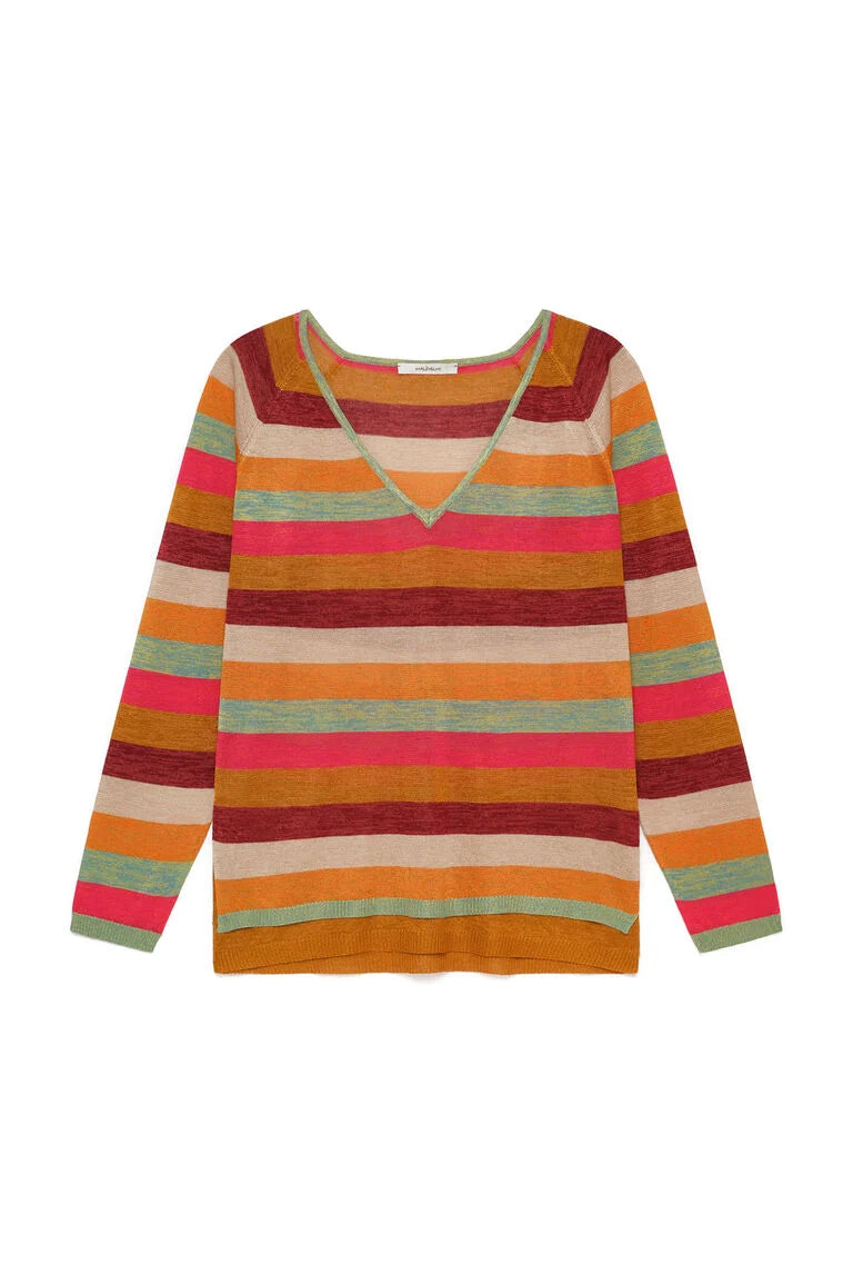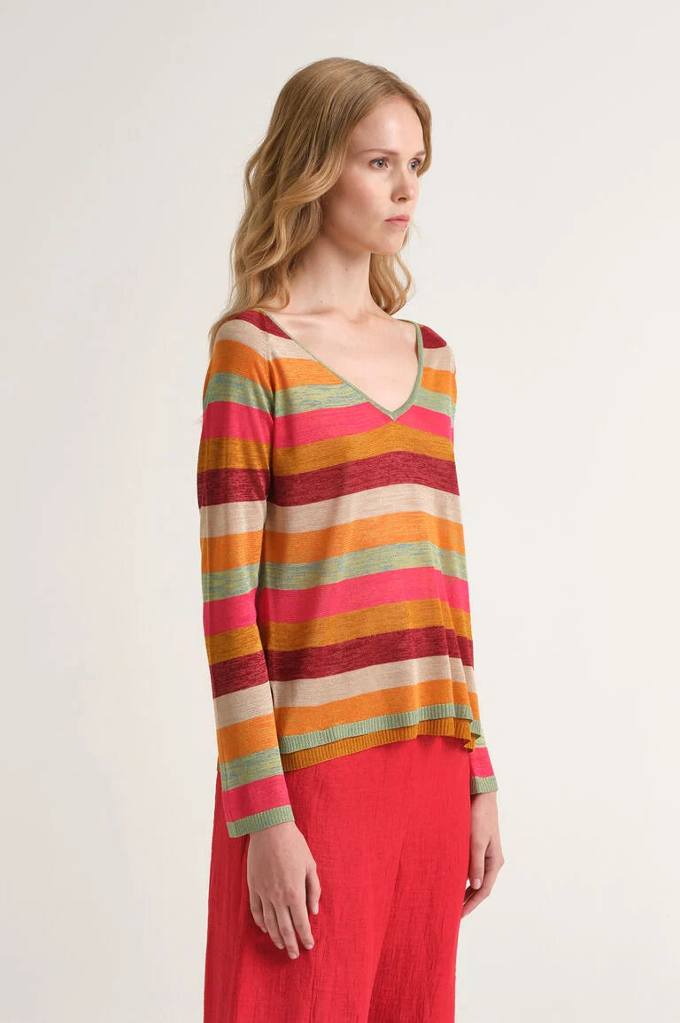 Malha fluída, decote em V à frente, mangas compridas.