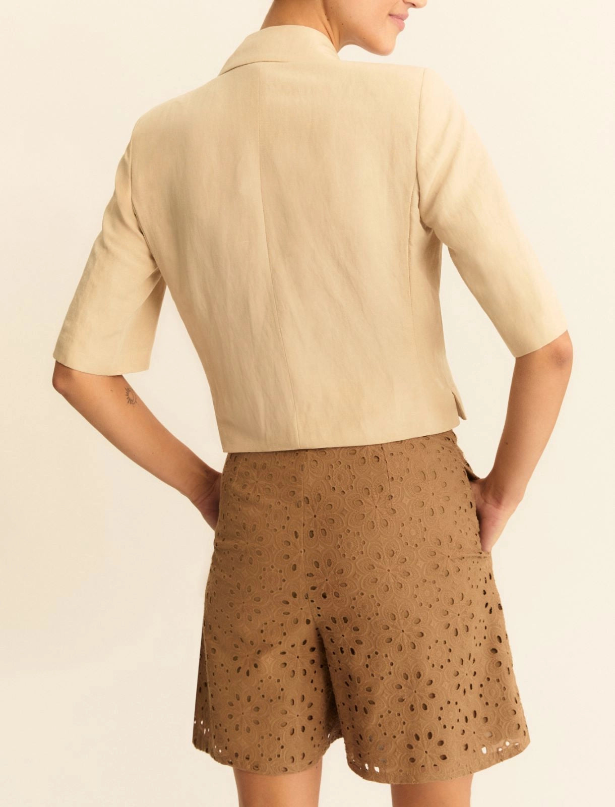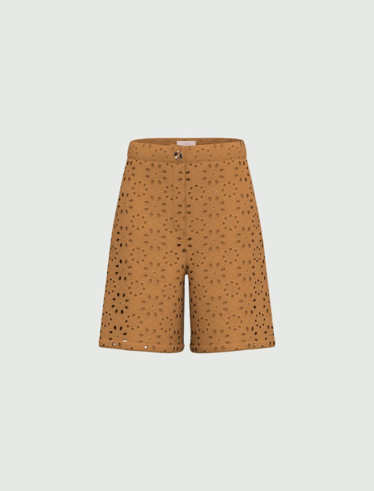 Shorts bermuda de corte regular em bordado inglês, bolsos laterais embutidos .