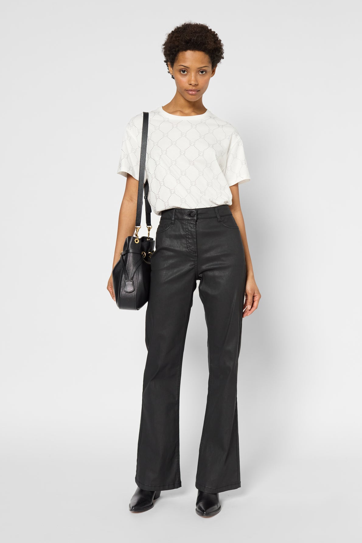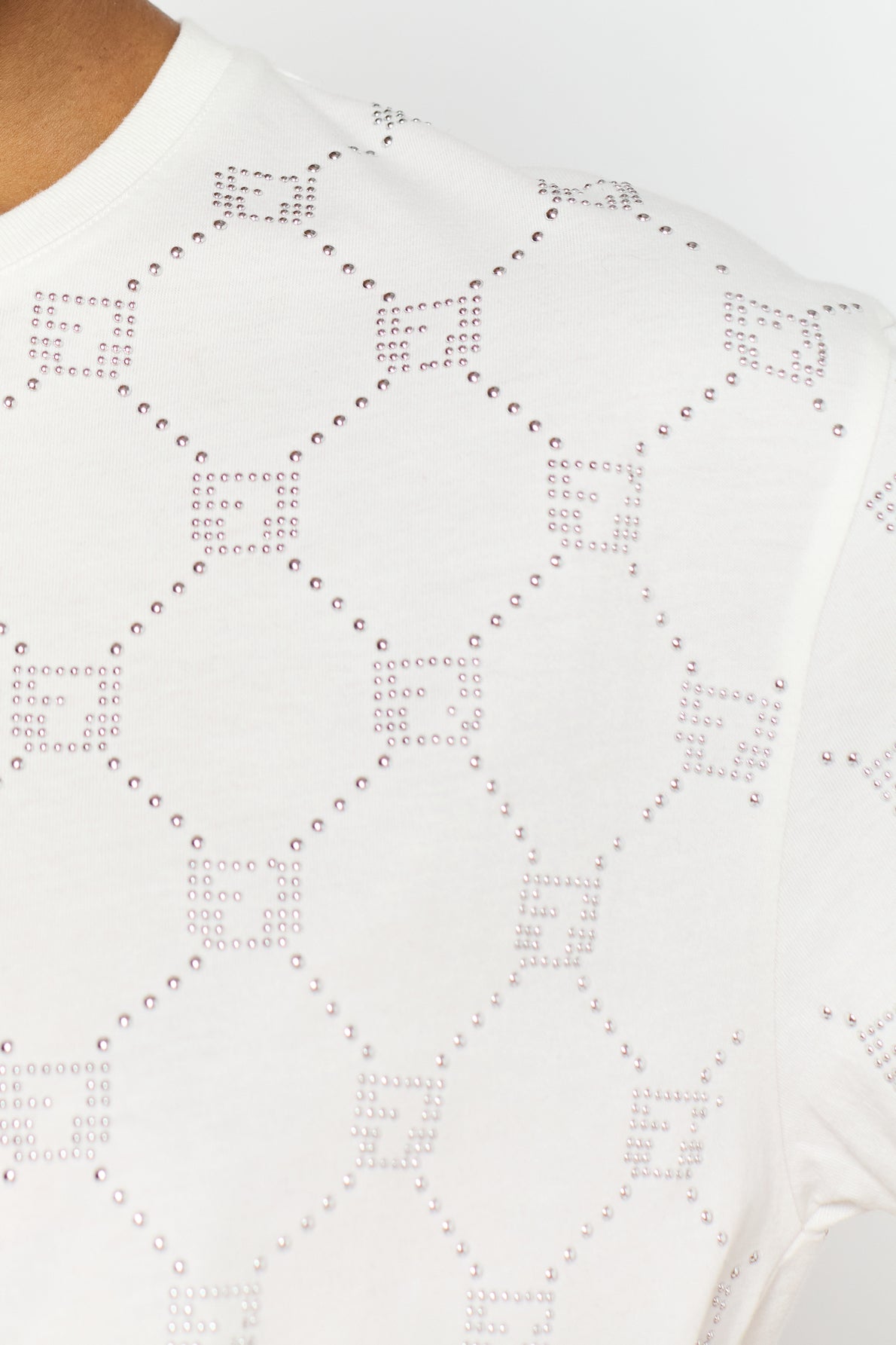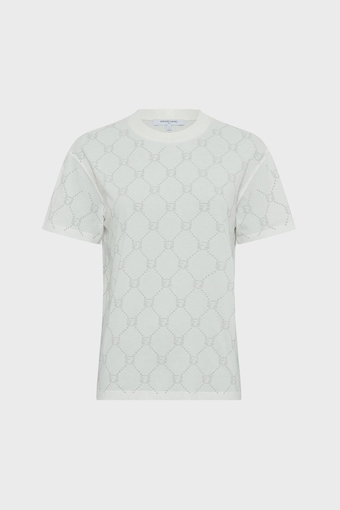 T-shirt em algodão, com padrão geométrico cravejado, estilo reto, manga curta, decote redondo .