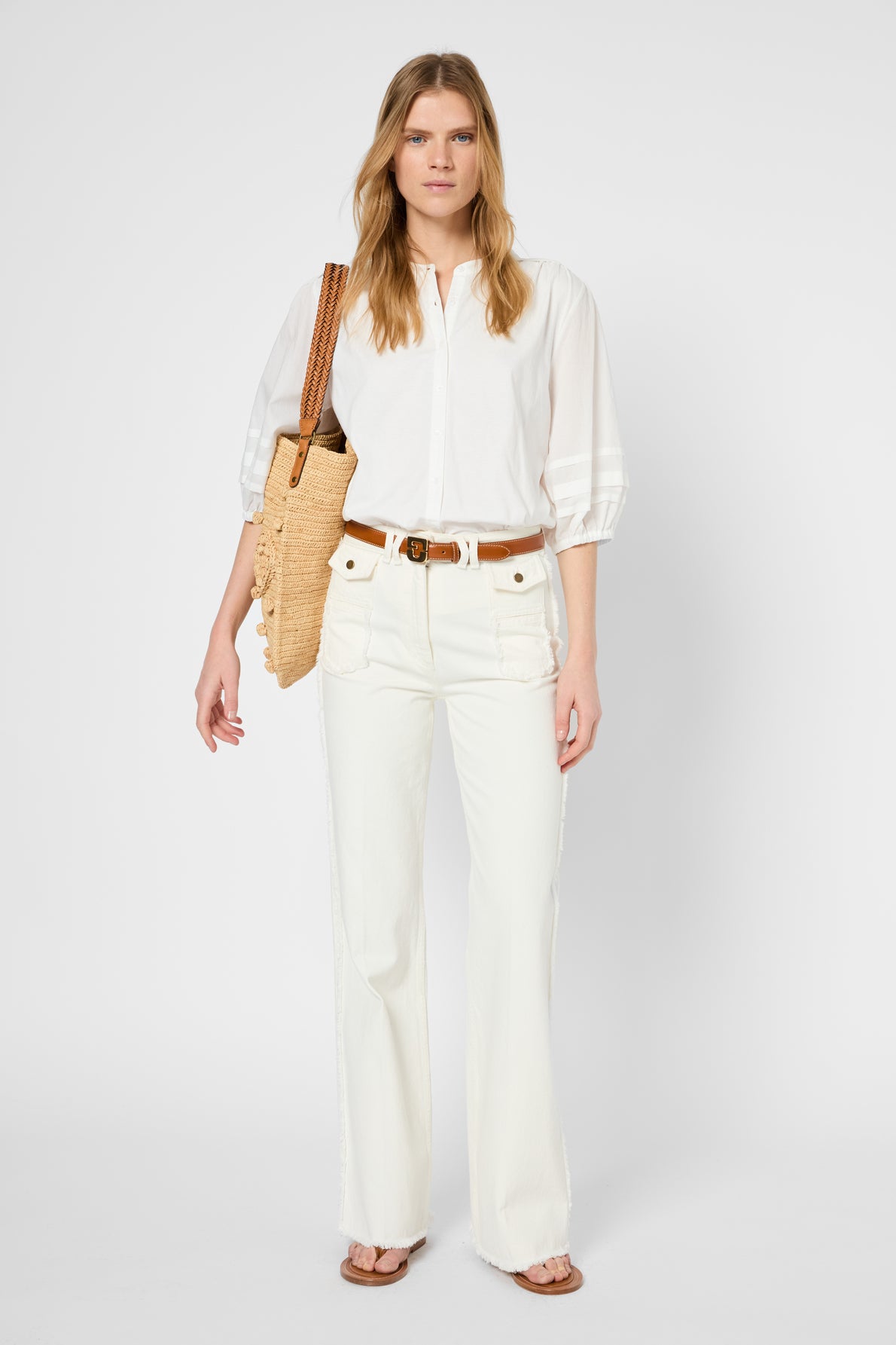 Blusa de corte reto e fluído, mangas 3/4, decote redondo, aperta com pequenos botões à frente.