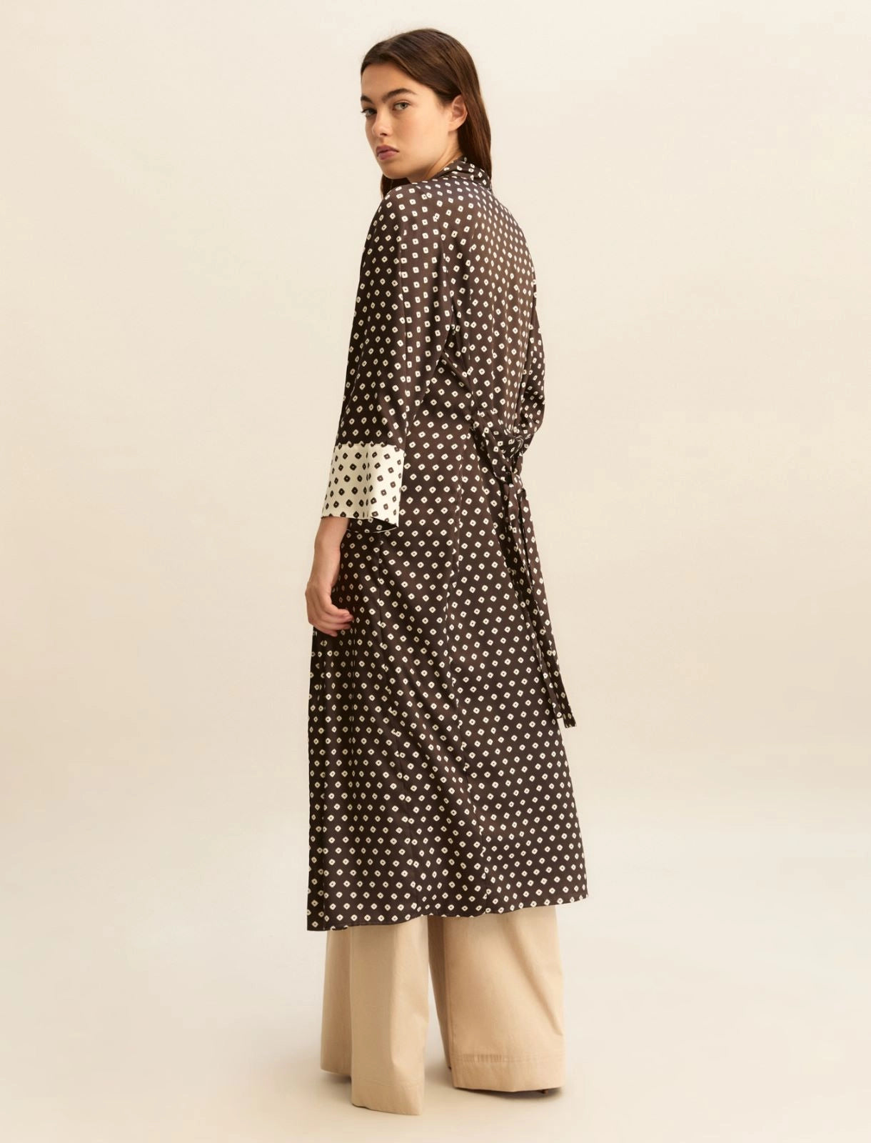 Kimono longo de corte regular, mangas 3/4 e cinto em tecido.