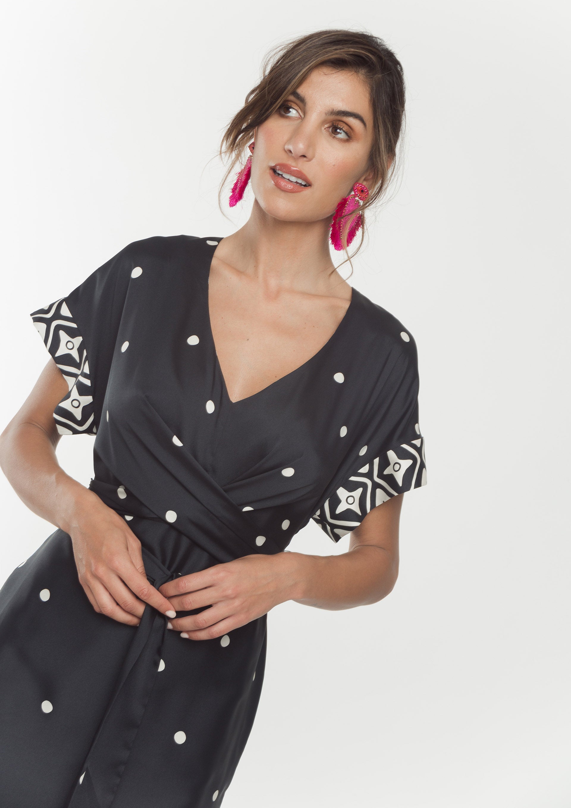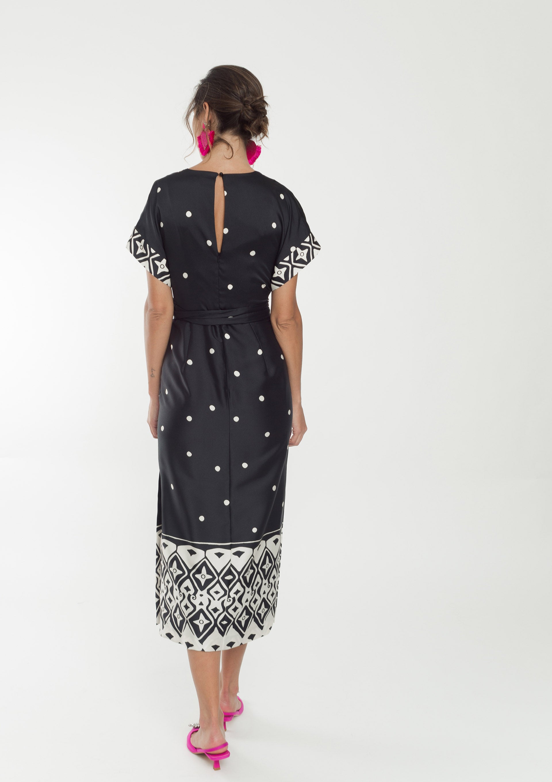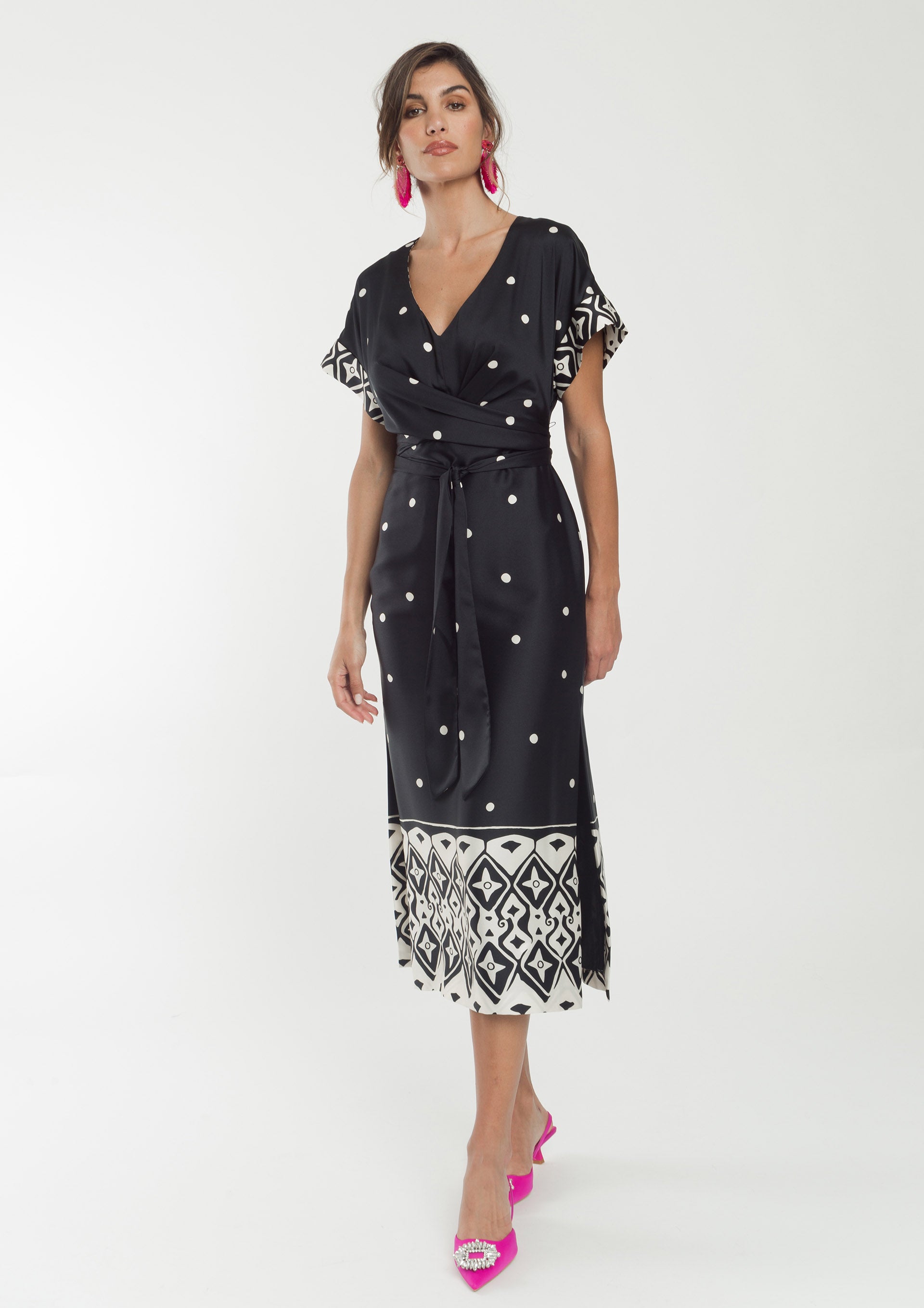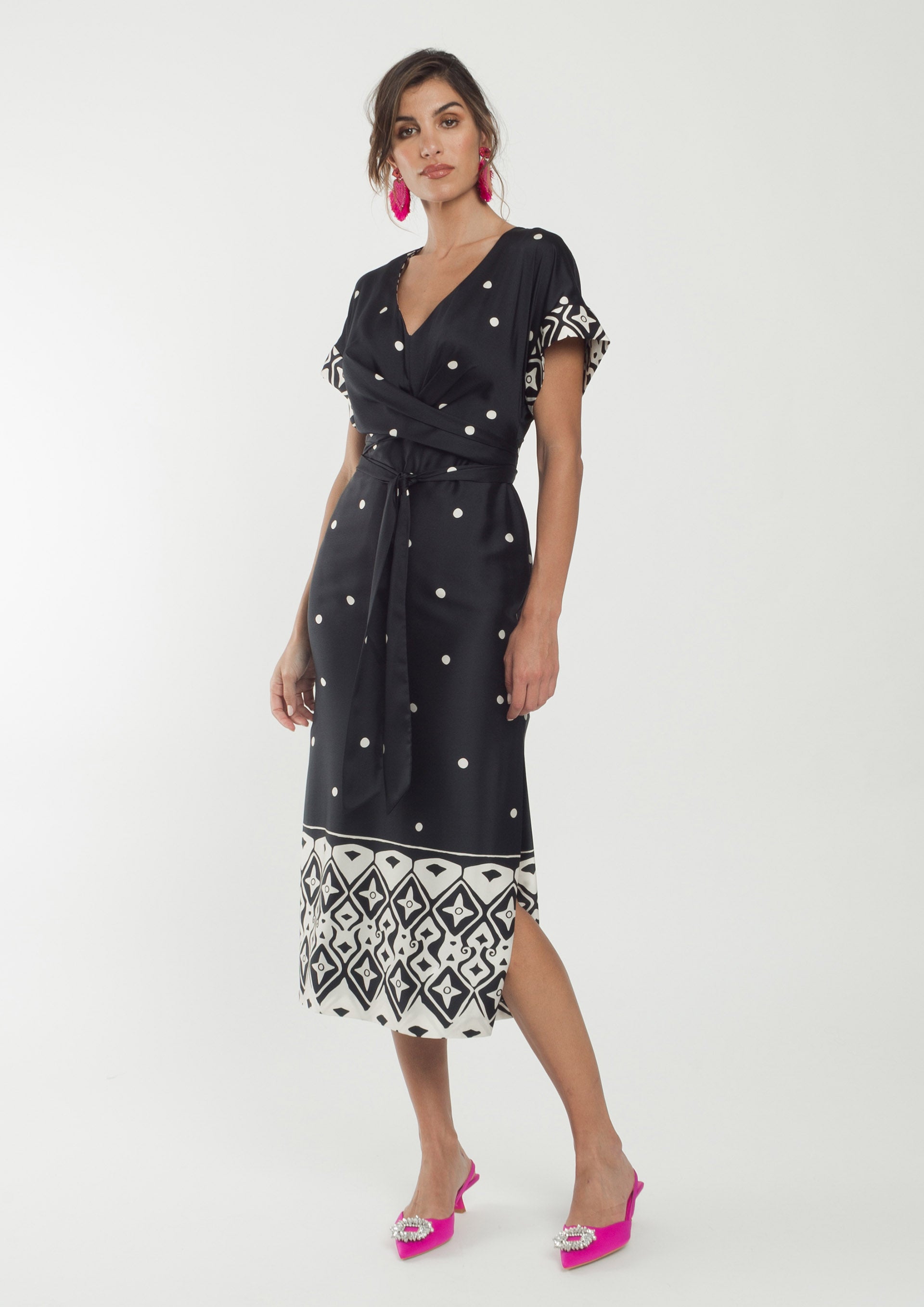 Vestido midi, aberto do lado, com decote em V, à frente, com manga quimono.