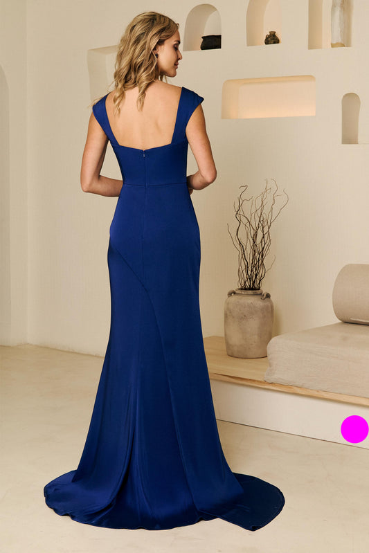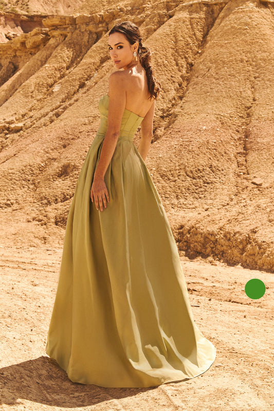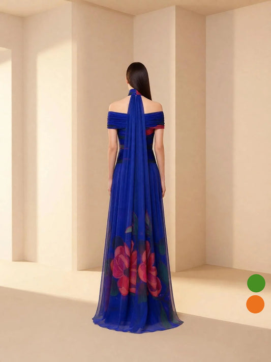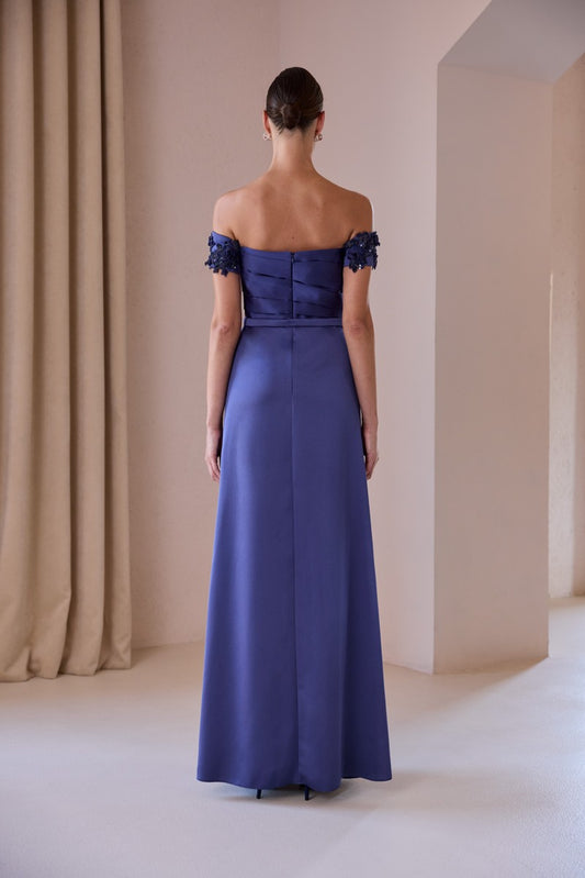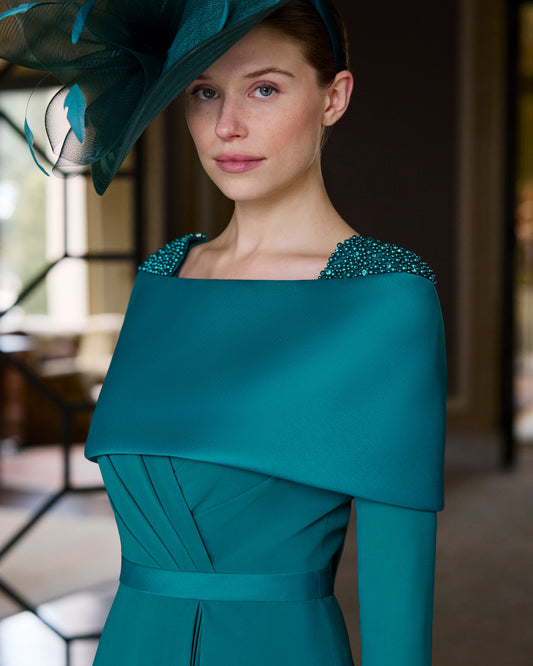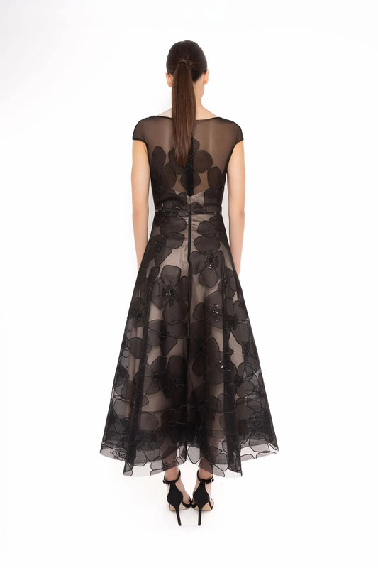 Vestido Couture, saia midi linha evasé, corpo em tule de renda, decote em V, nas costas, manga comprida em tule.