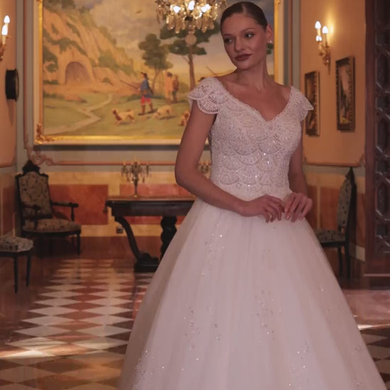 Vestido longo de linha romântica, saia em A, corpete deslumbrante com brilhantes e padrões de vieiras, manga curta.