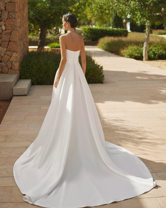 Vestido de noiva longo, linha reta, decote quadrado na frente, costas em renda, alça fina com pedraria, formando uma aba nas costas, pormenor de botões ao longo da saia atrás.
