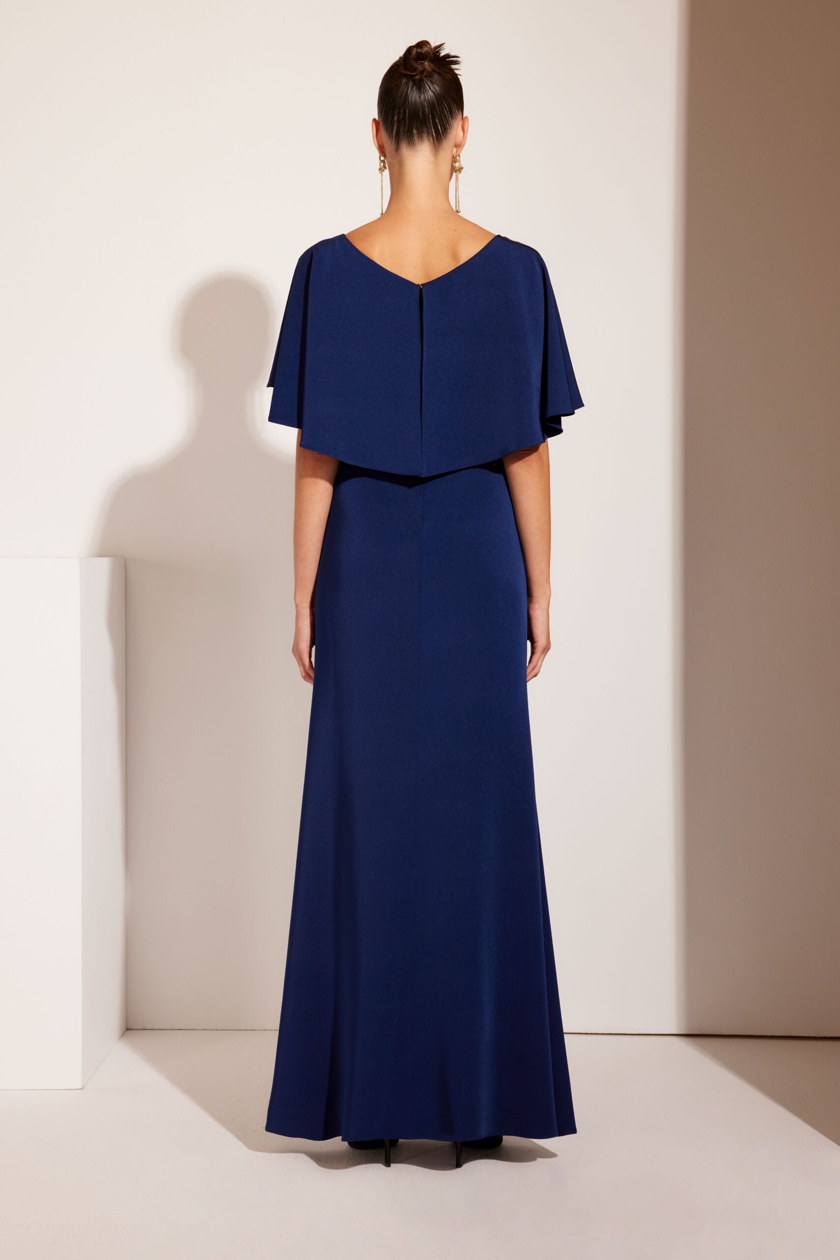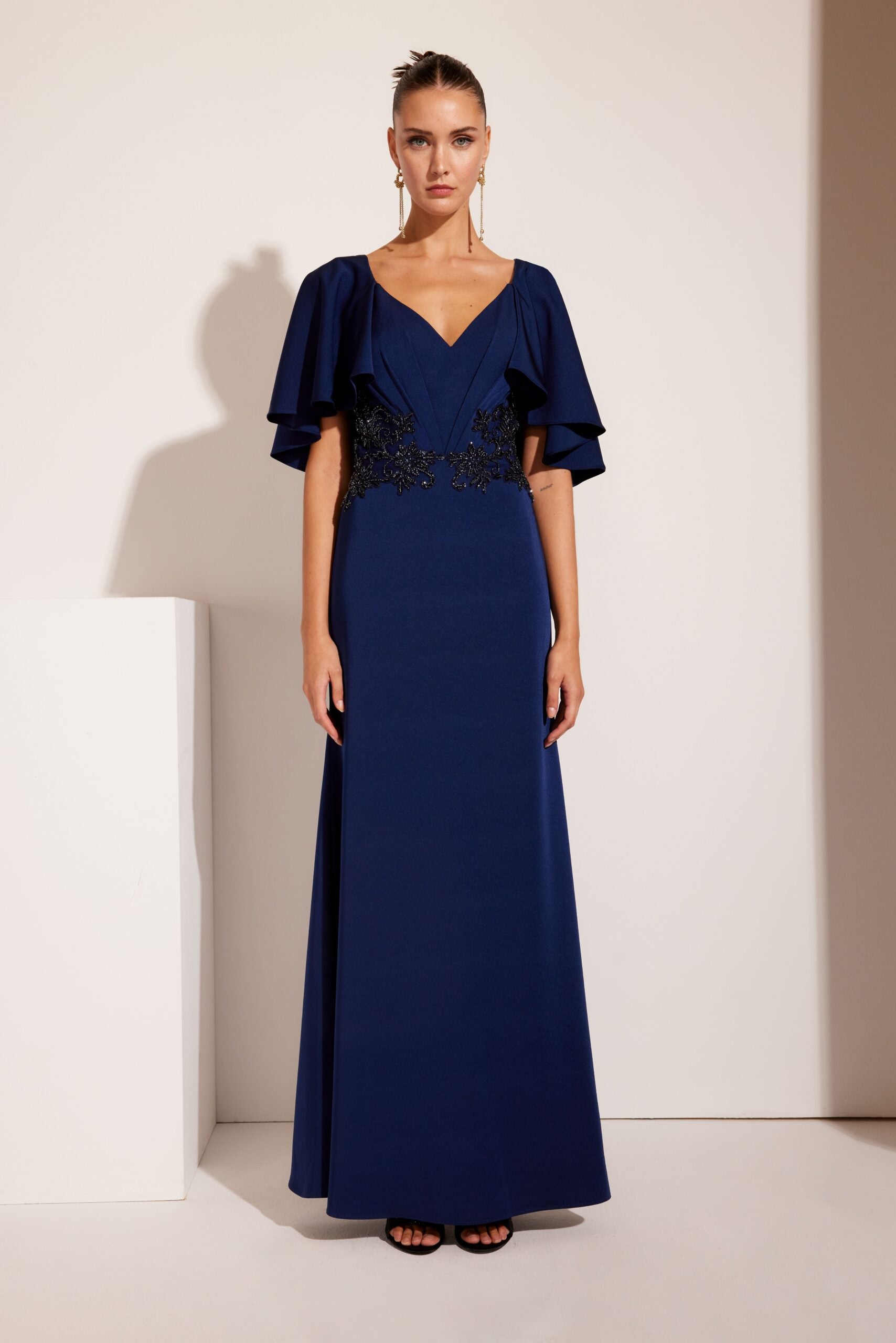 Vestido longo, saia fluída, decote em V, manga formada por folho até ao cotovelo, com pormenor de capa nas costas. Pormenor de brilhos em volta da cintura.