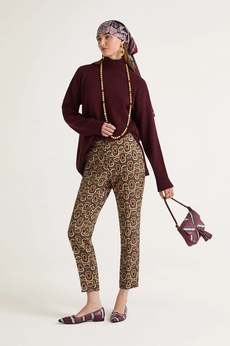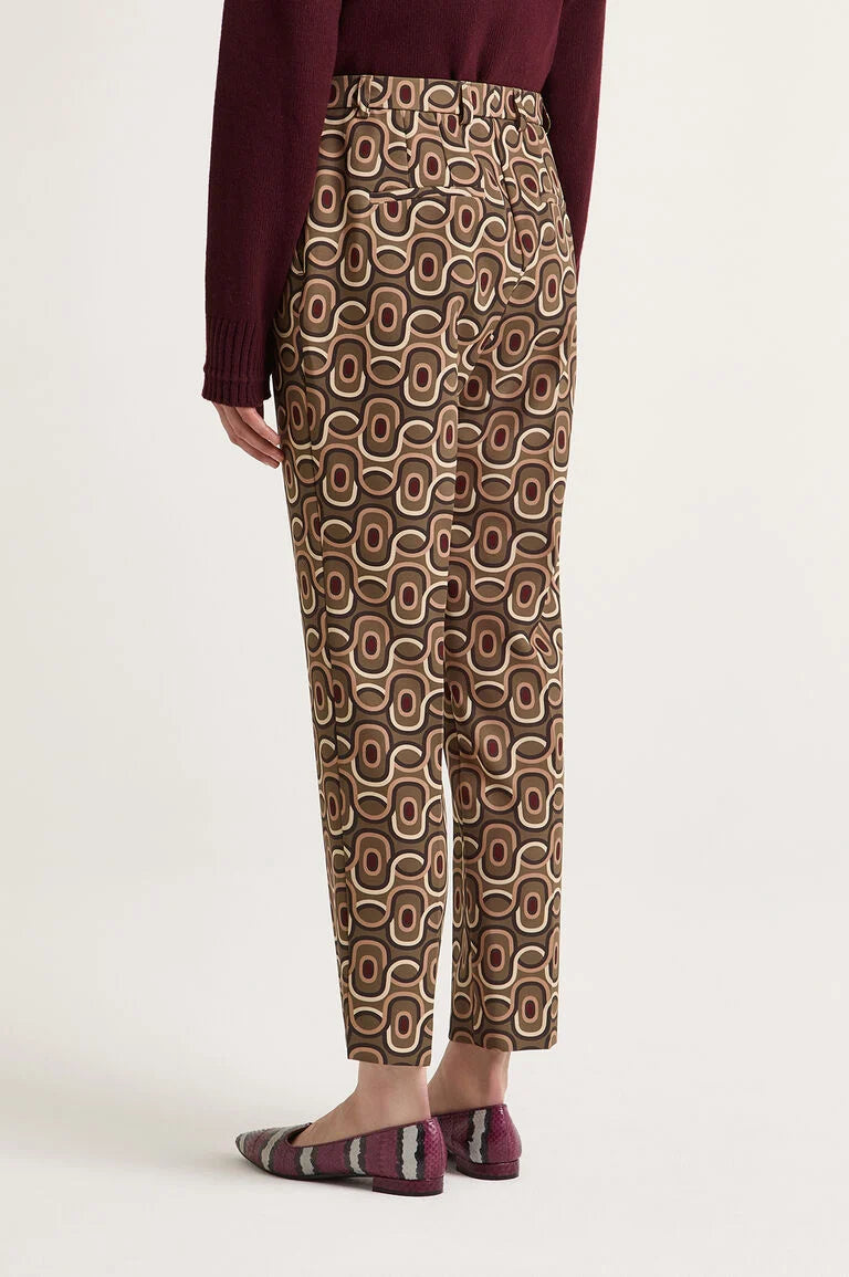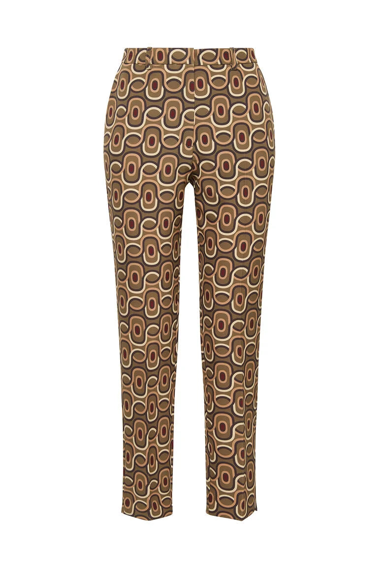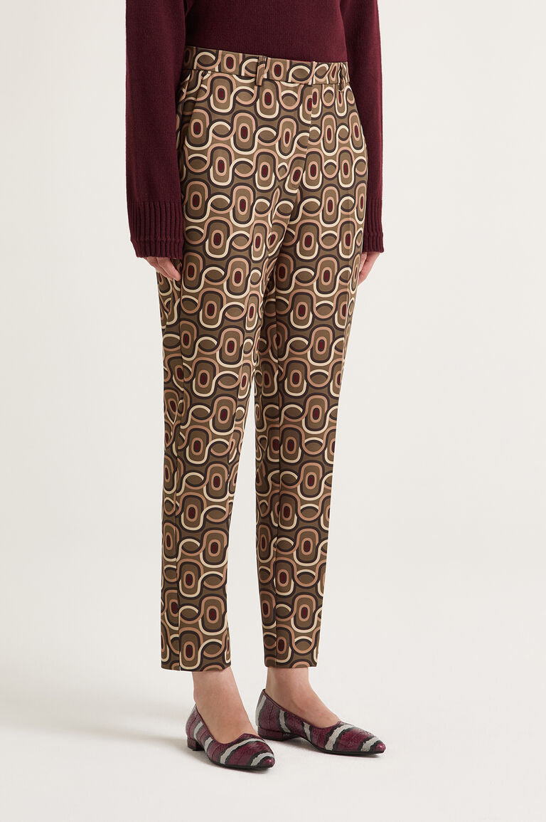 Calça cady cigarrete com estilo gráfico e ousado, com elastano, comprimento pelo tornozelo, fendas laterais .