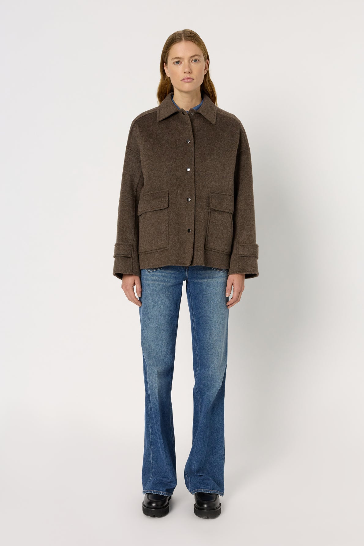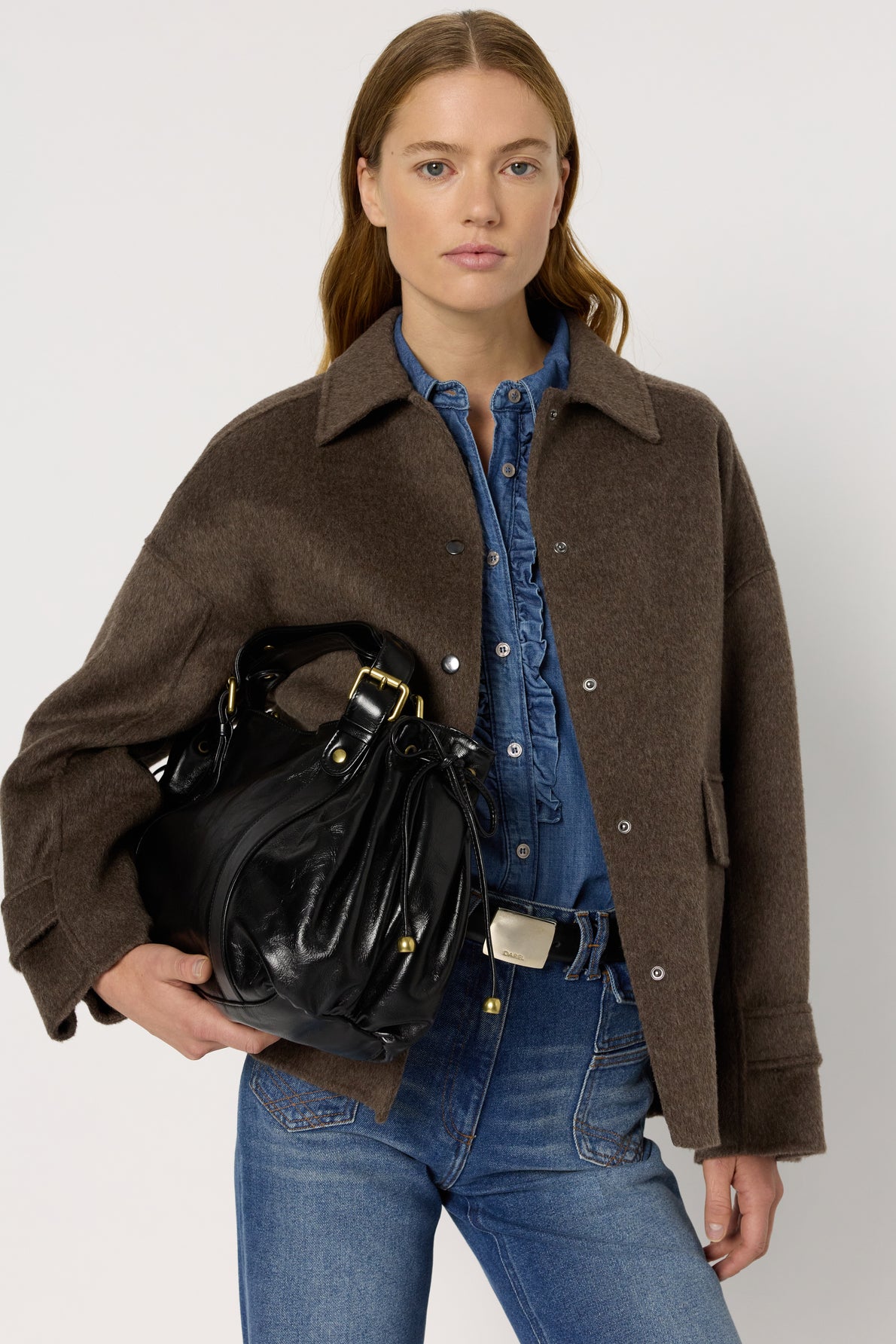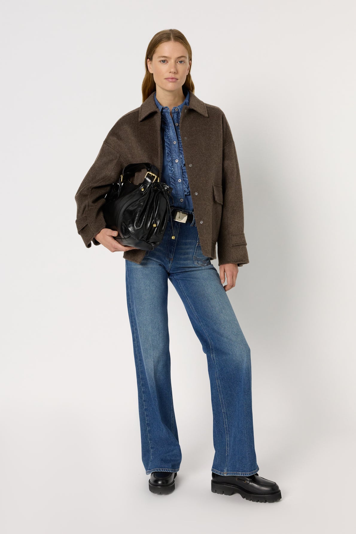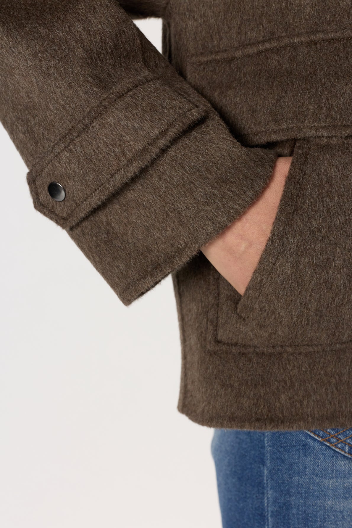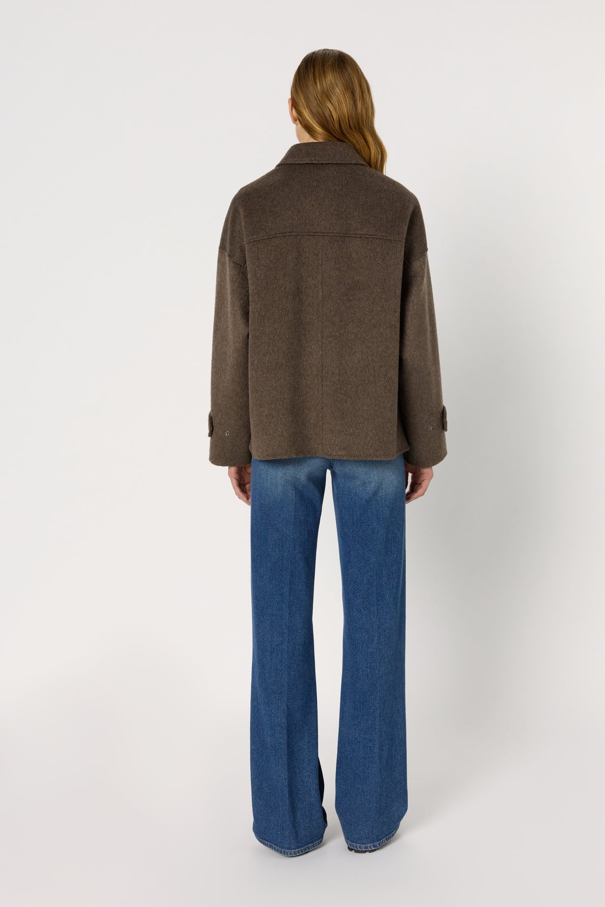 Casaco curto em lã, ombros descaídos, gola tipo camisa.