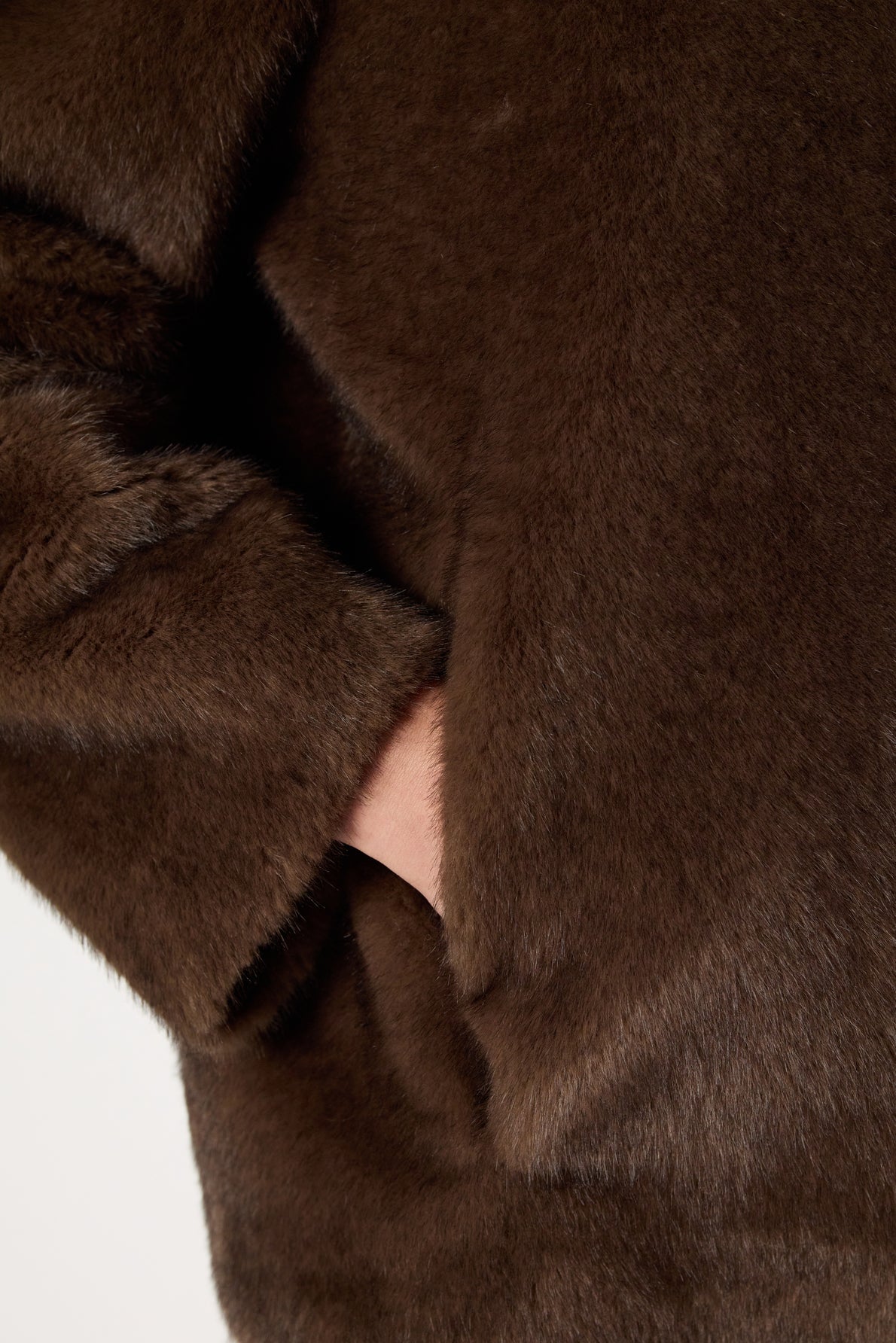 Casaco curto em pele sintética, de corte reto, gola com capuz .
