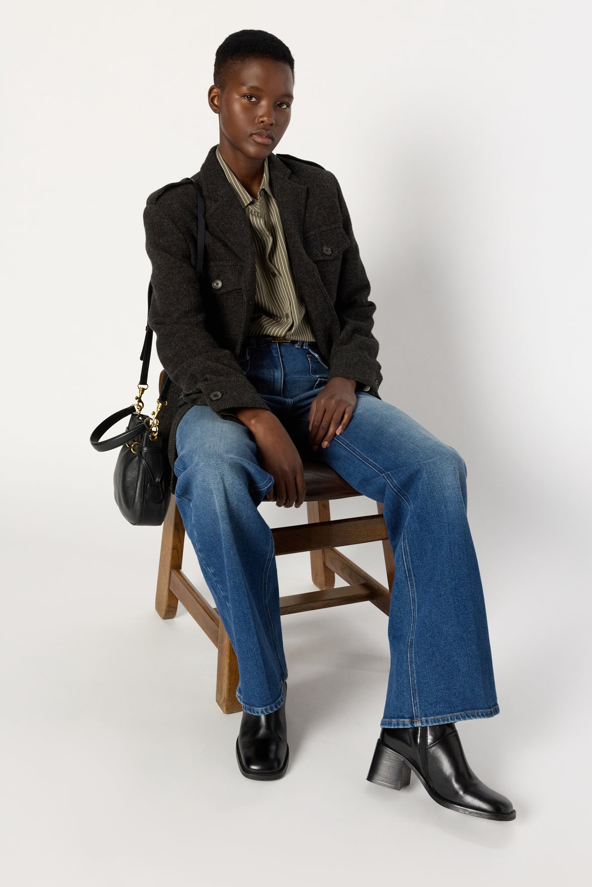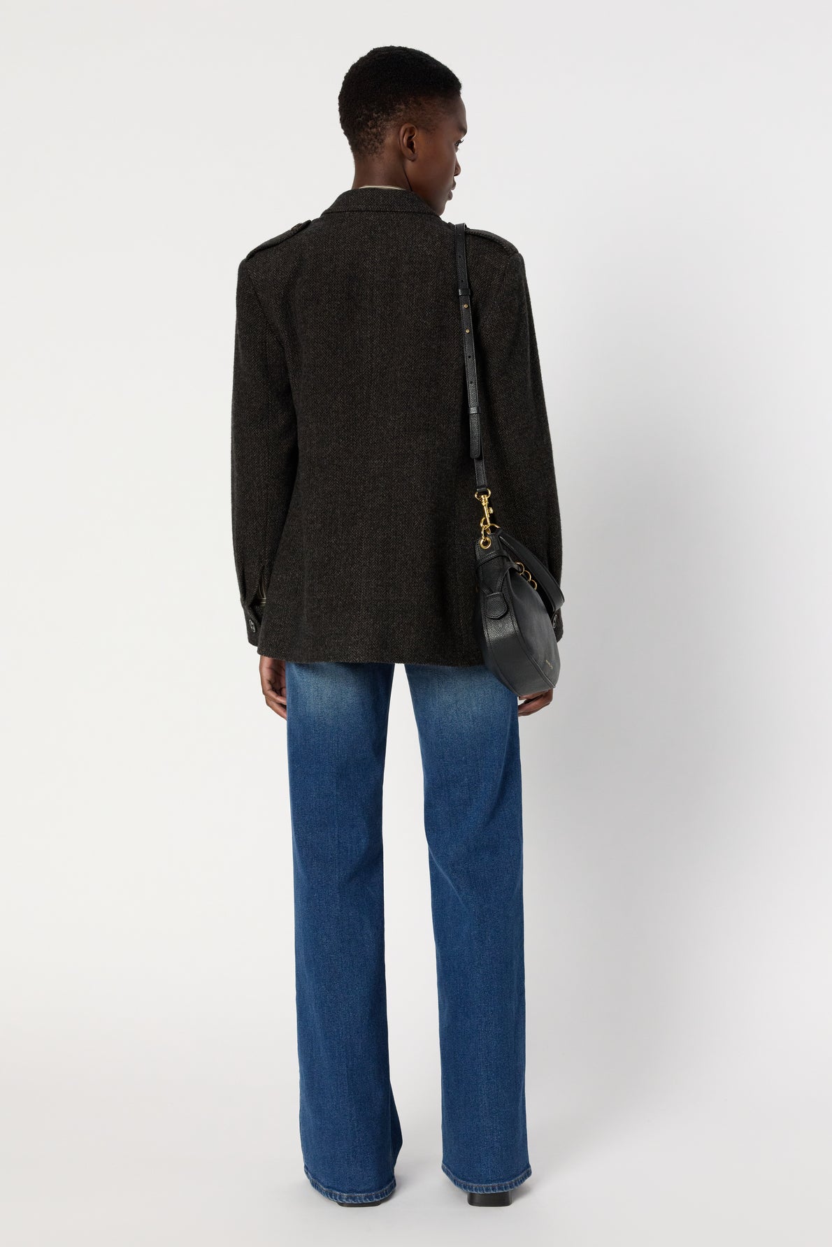 Casaco curto em padrão espinha de peixe, confecionado em lã. Modelo reto .