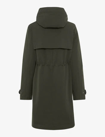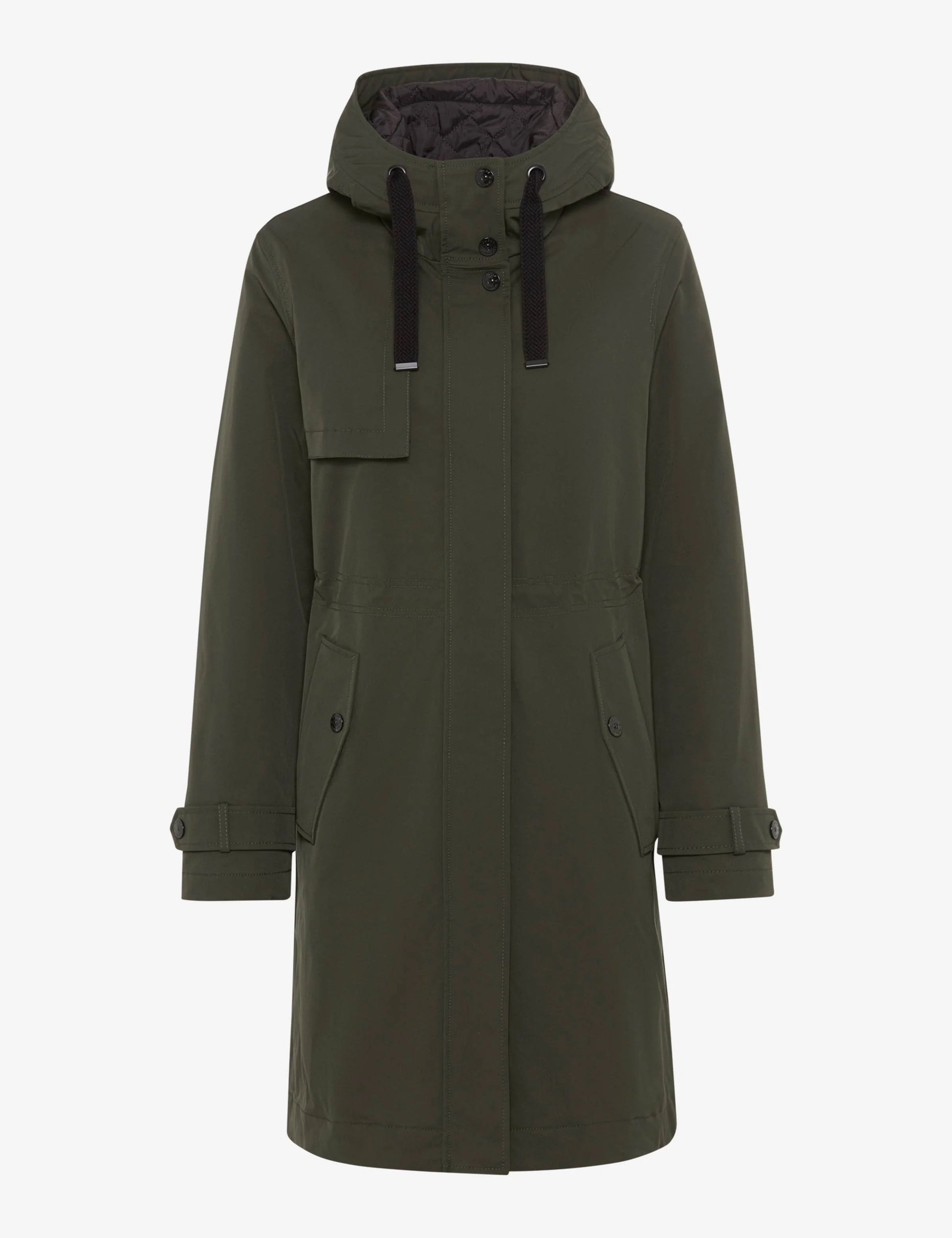Impermeável estilo Estocolmo, de corte reto, com ajuste na cintura, capuz fixo, bolsos laterais.