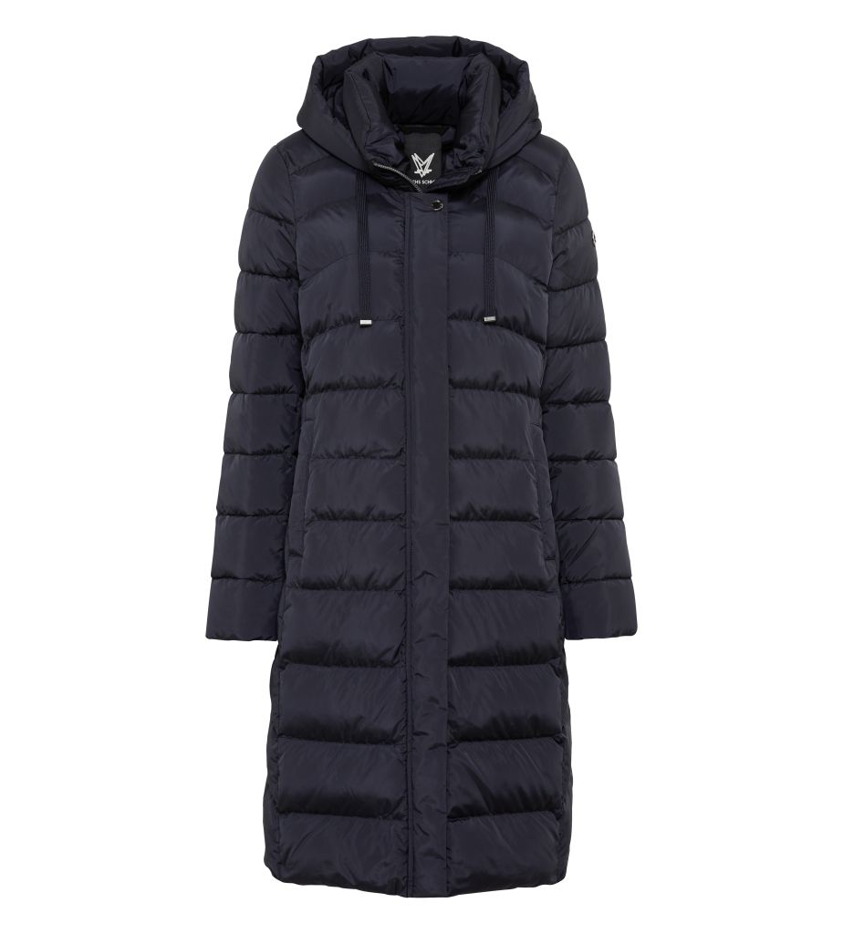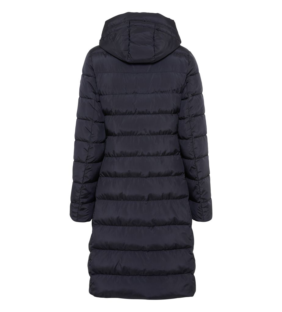 Impermeável de corte reto, capuz fixo e bolsos laterais.