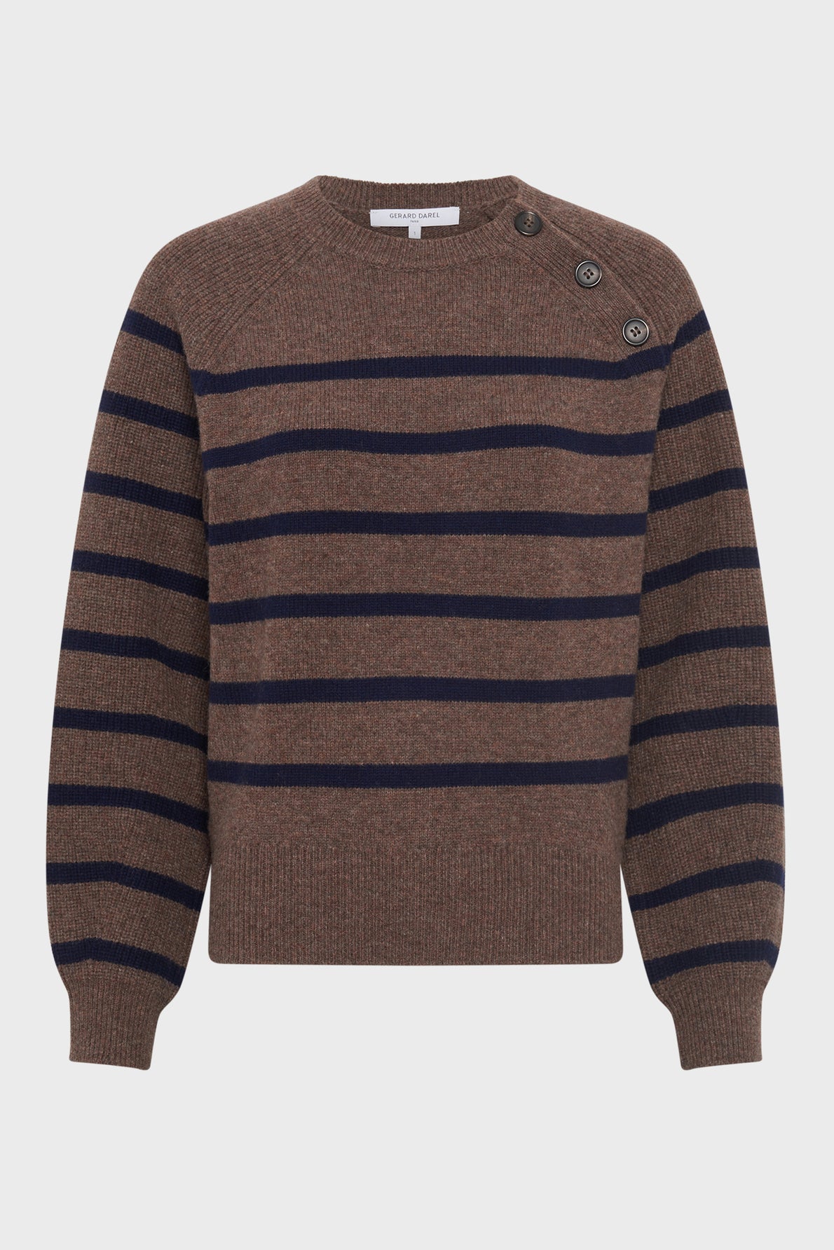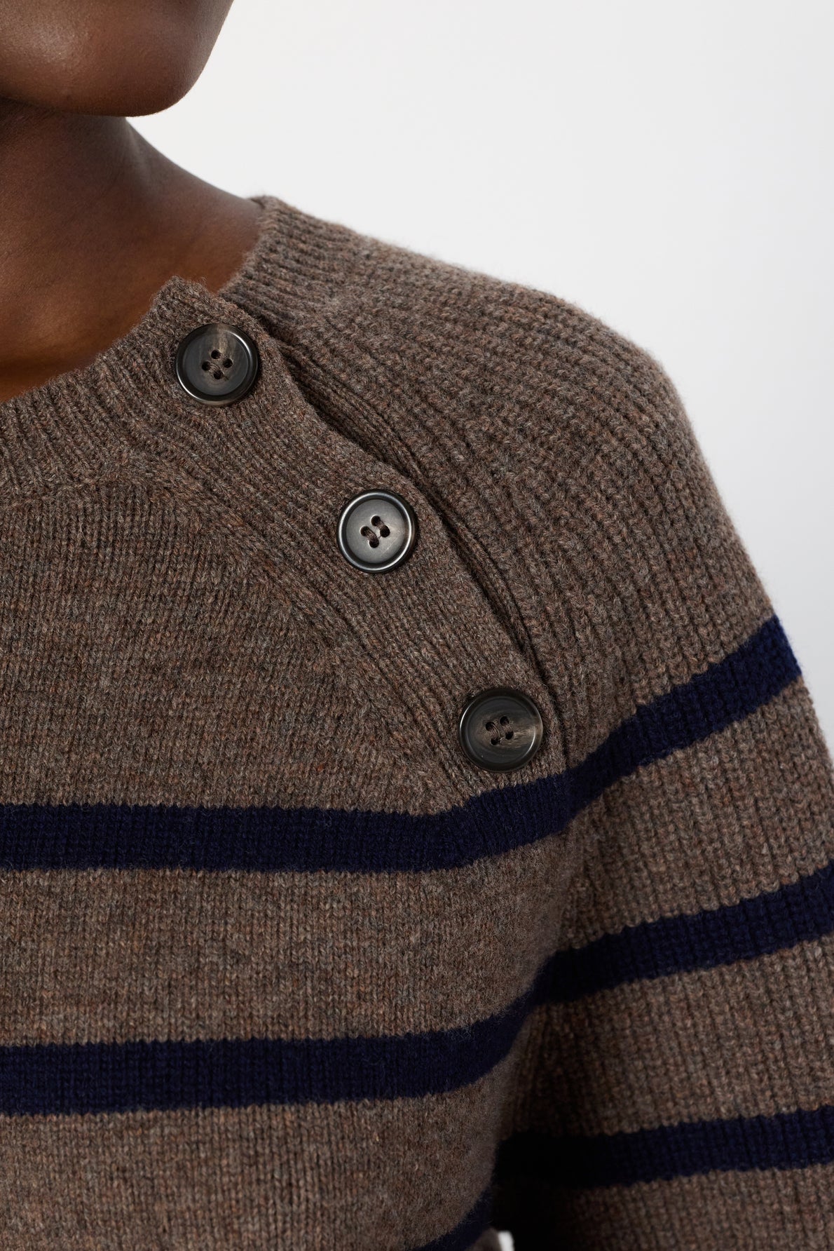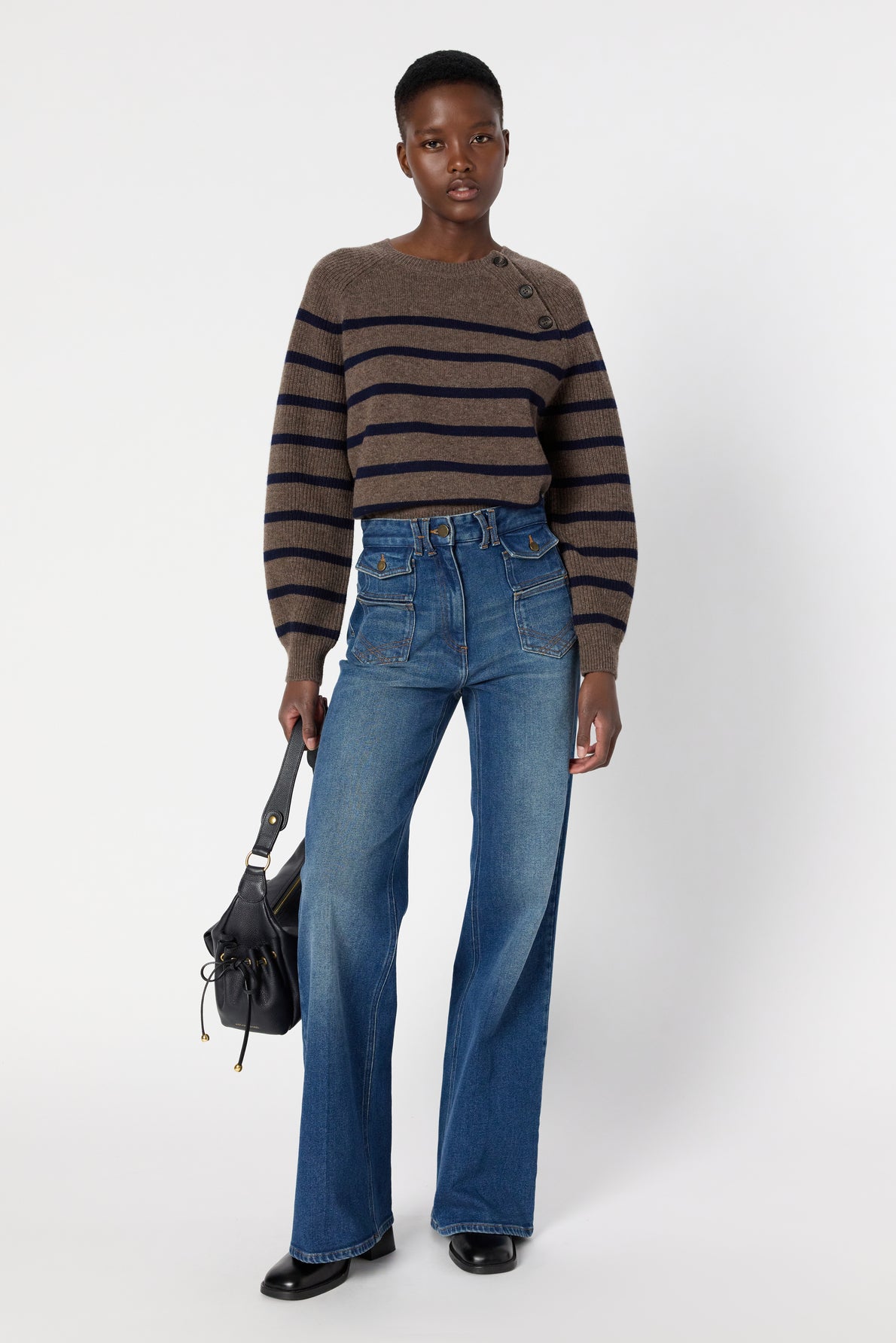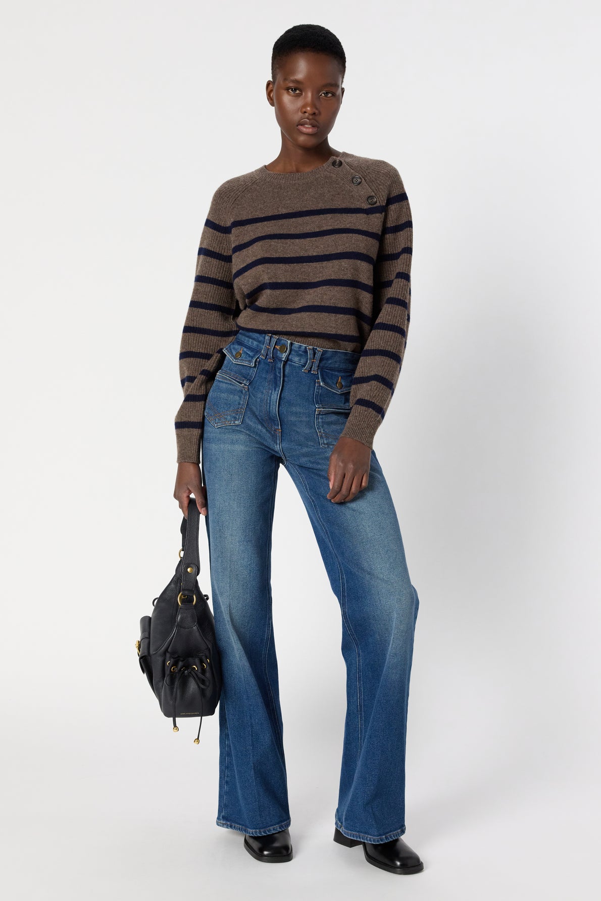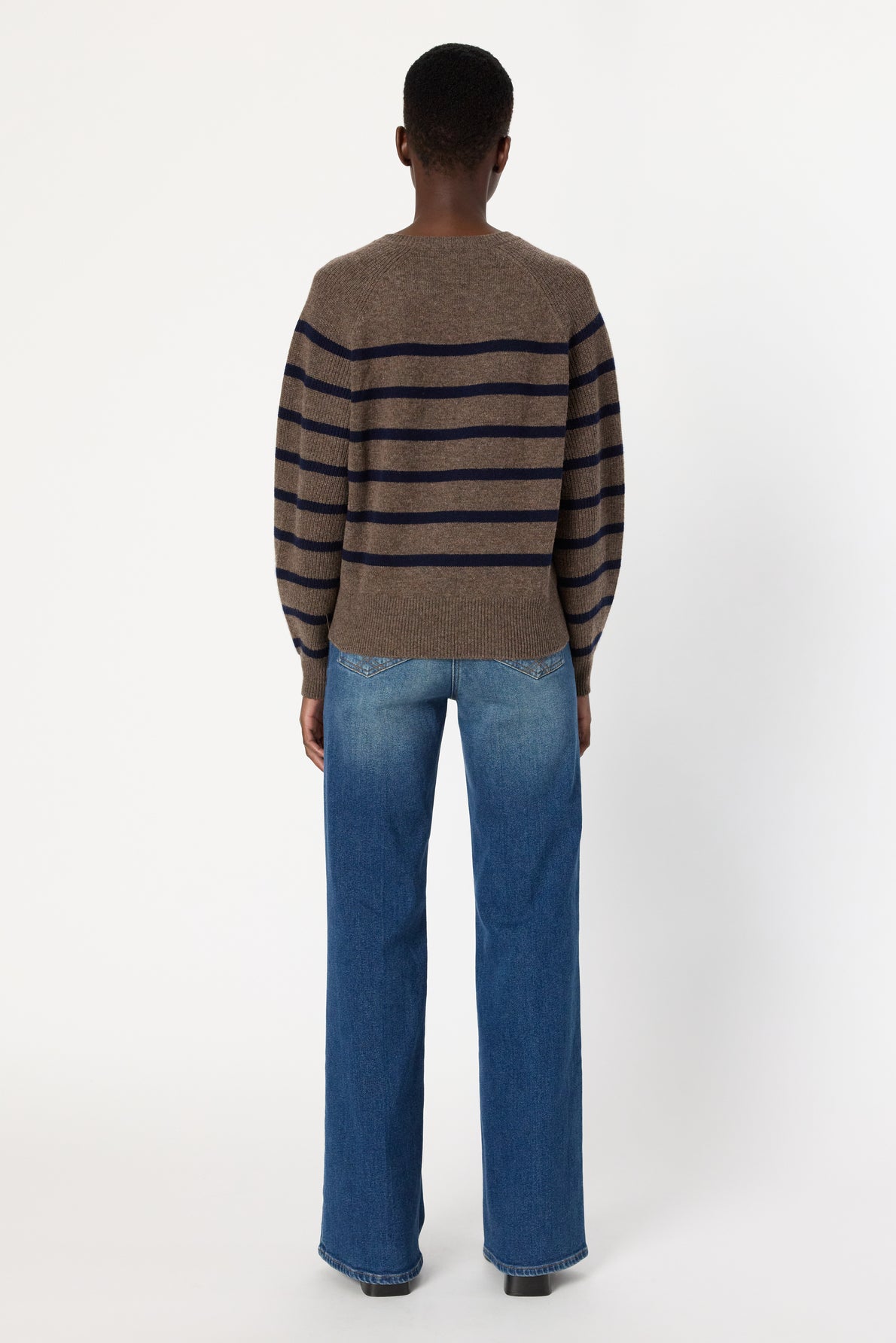 Malha estilo marinheiro em lã com riscas, de corte reto, mangas raglan, decote redondo.