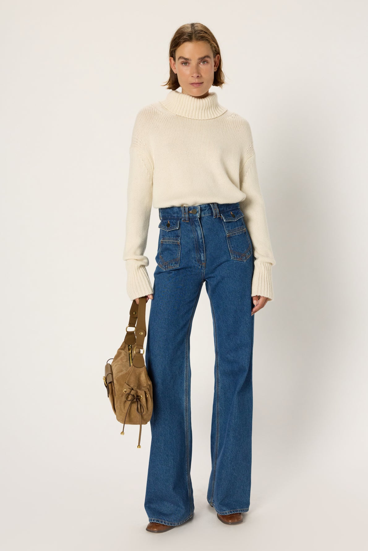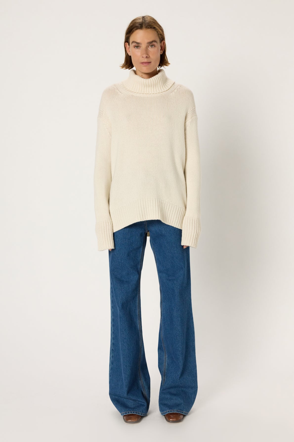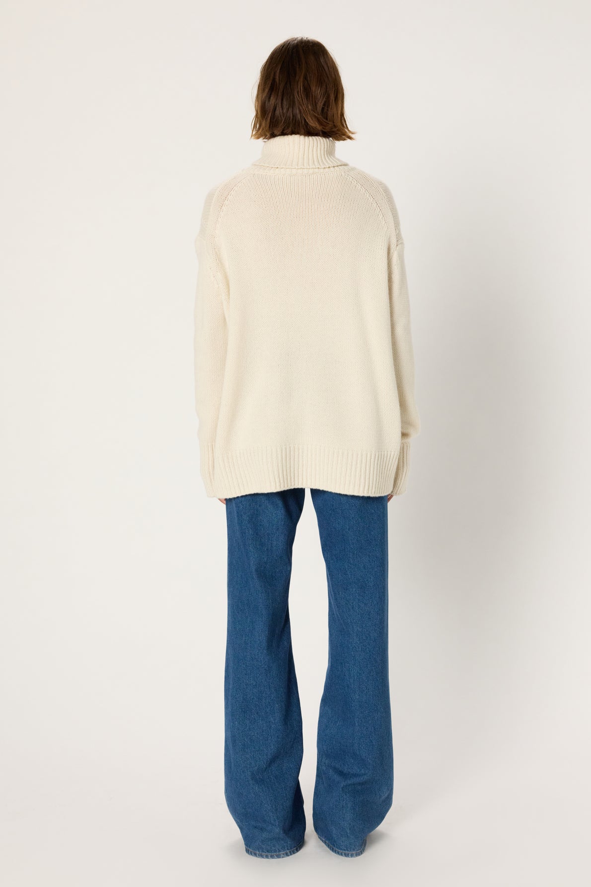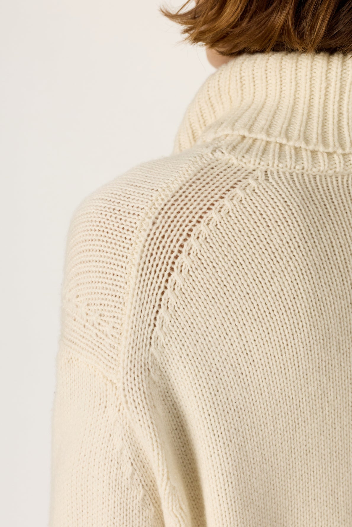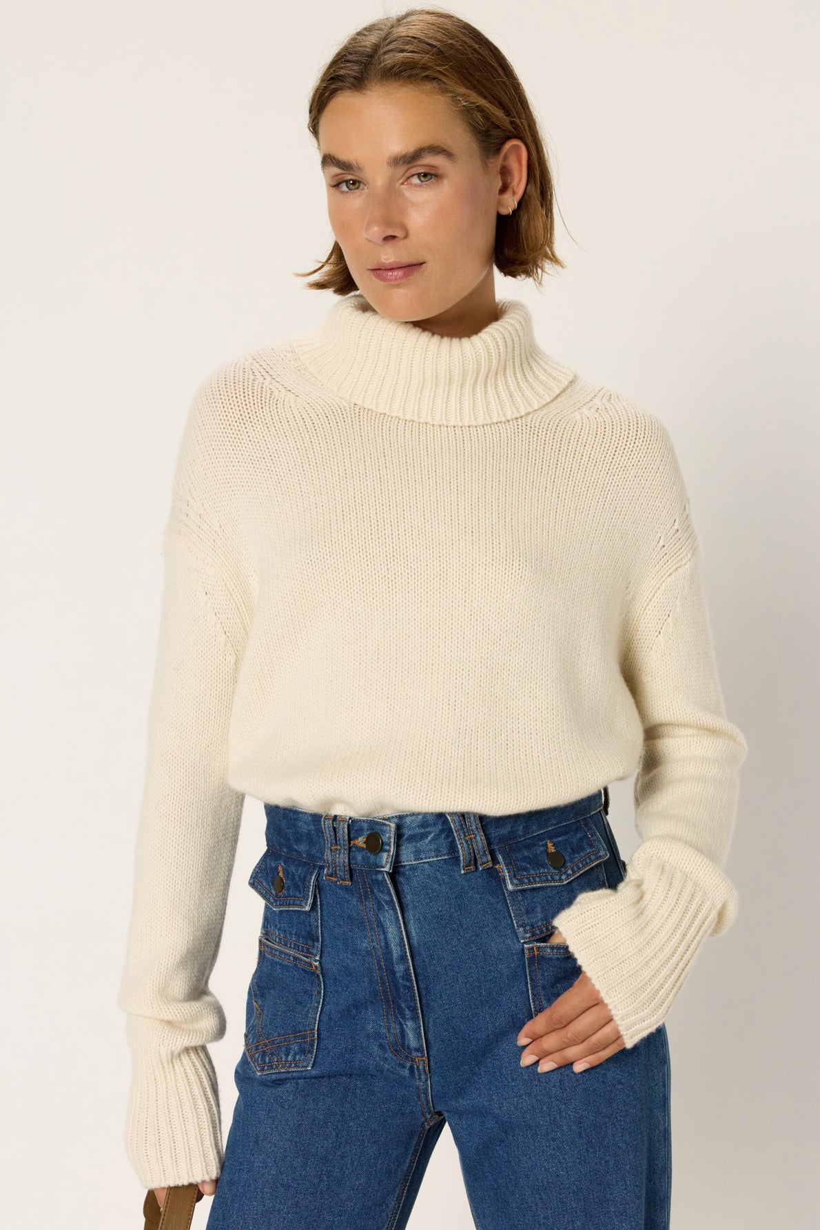 Malha em lã de caxemira, corte reto e solto , gola alta e mangas descaídas.