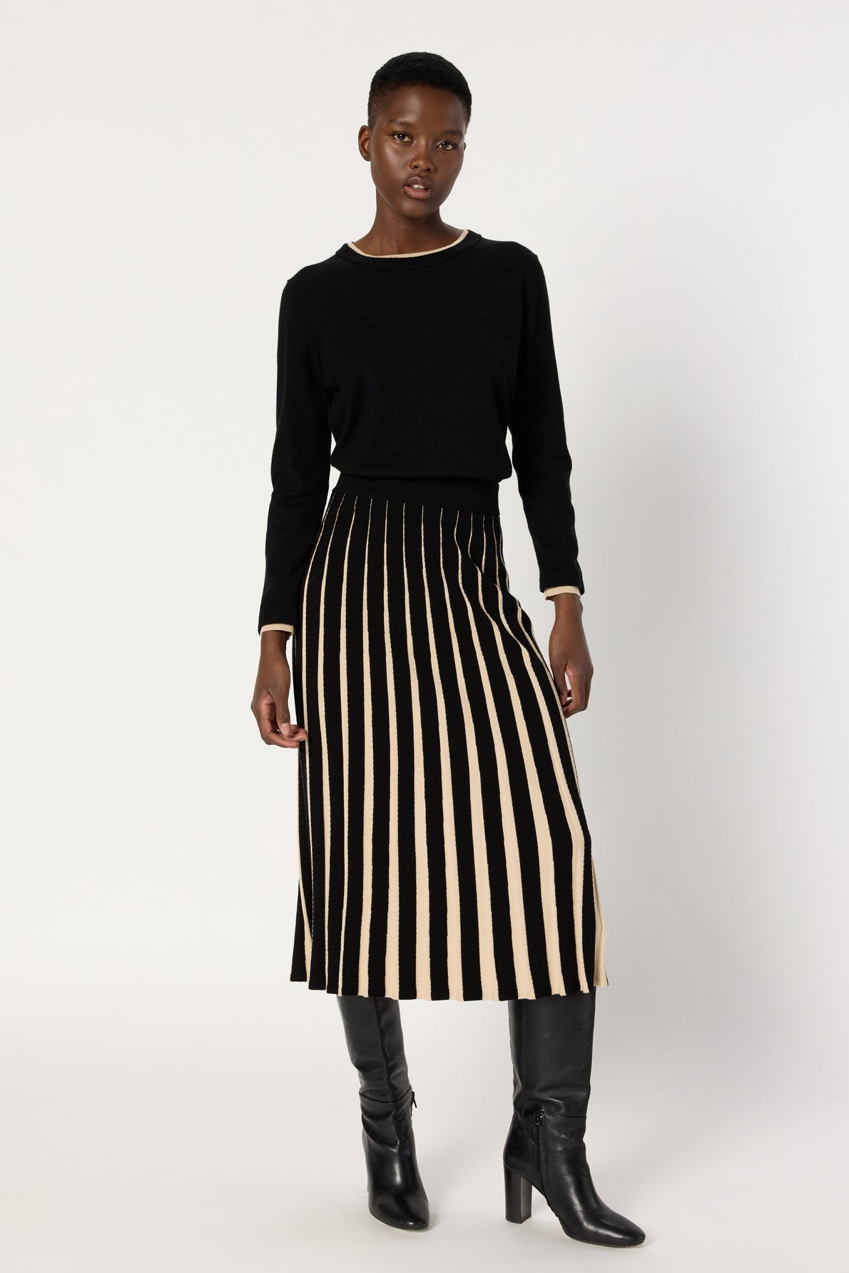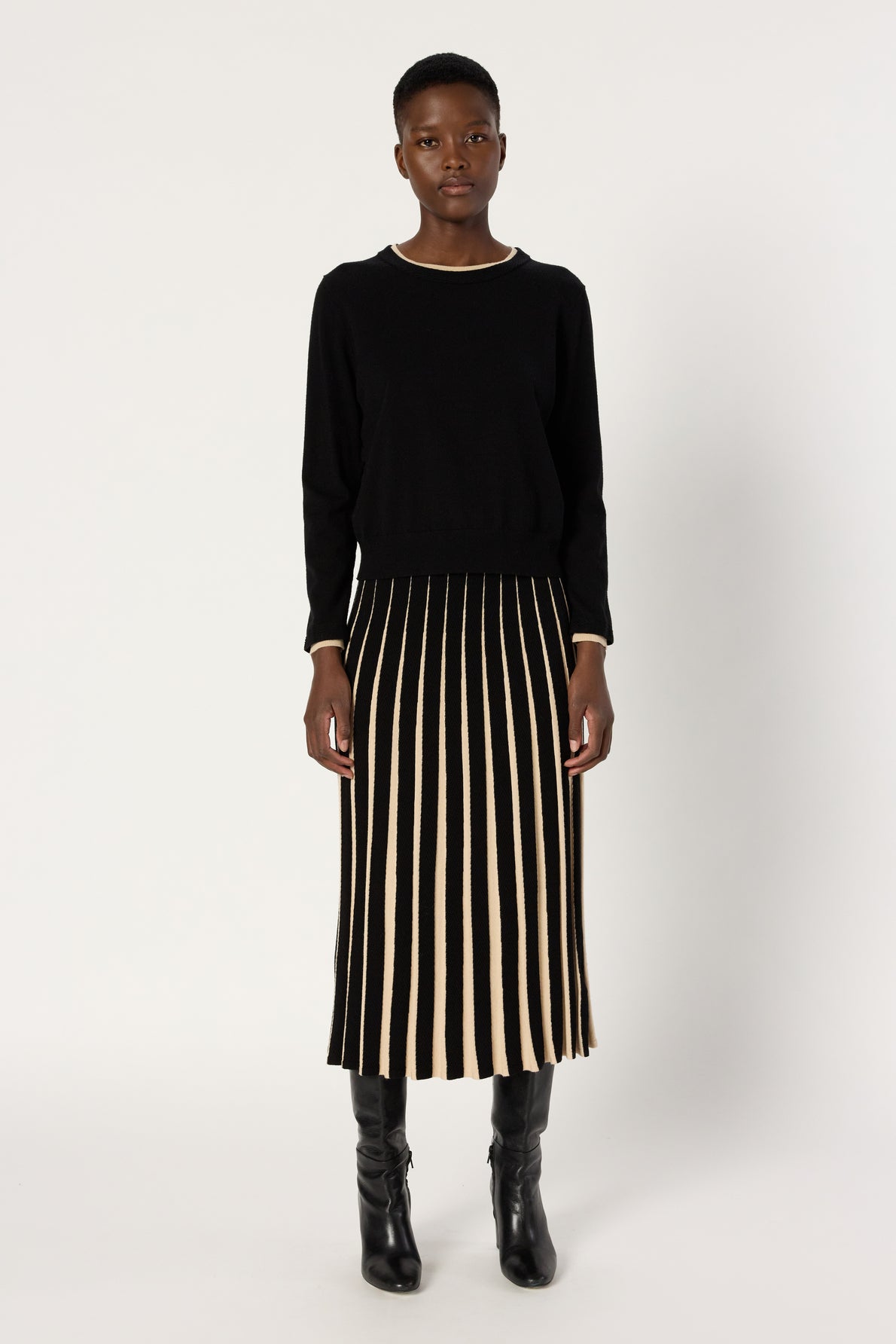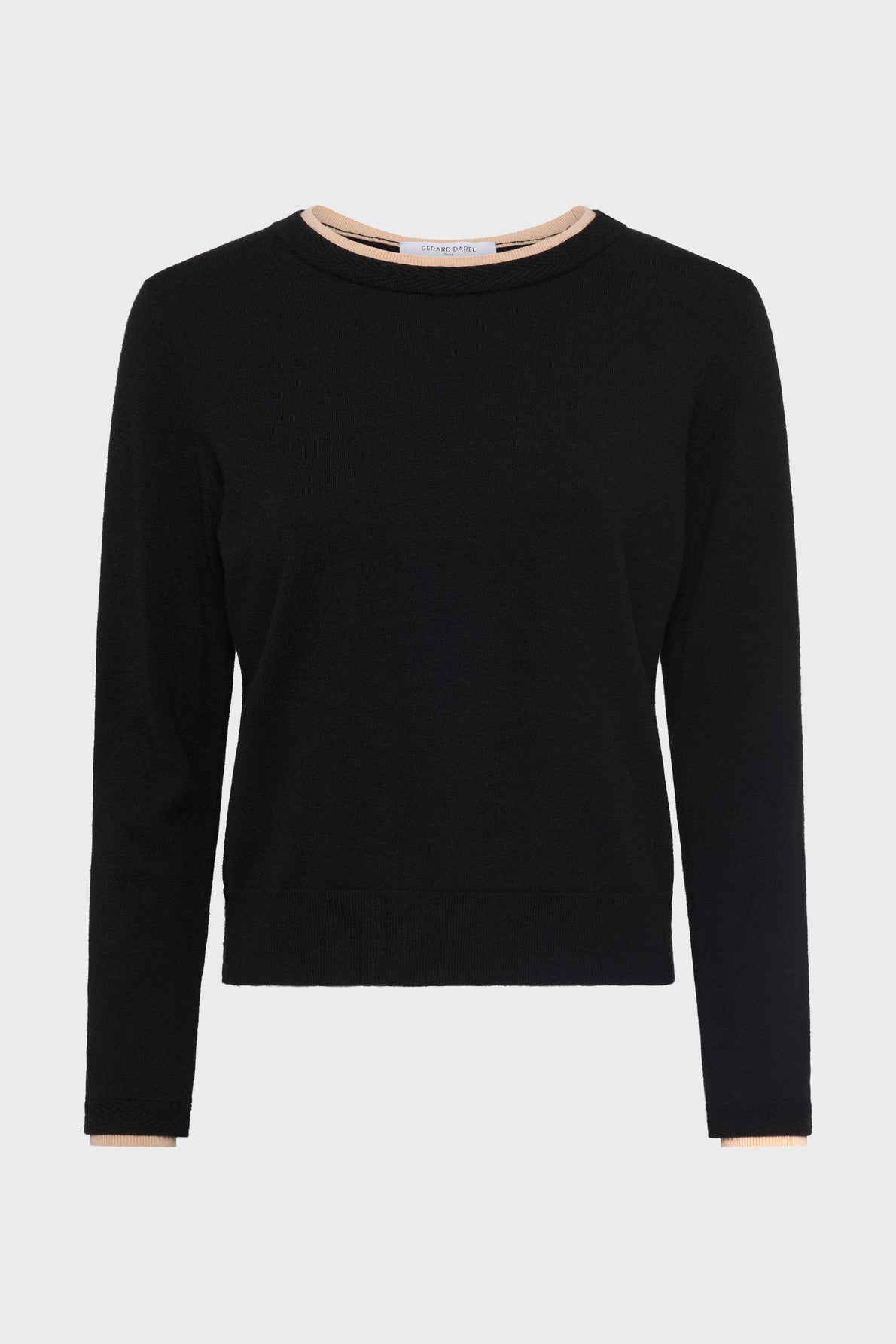 Malha lisa, de corte reto, mangas compridas, decote redondo, com sobreposição de malha em cor camelo.