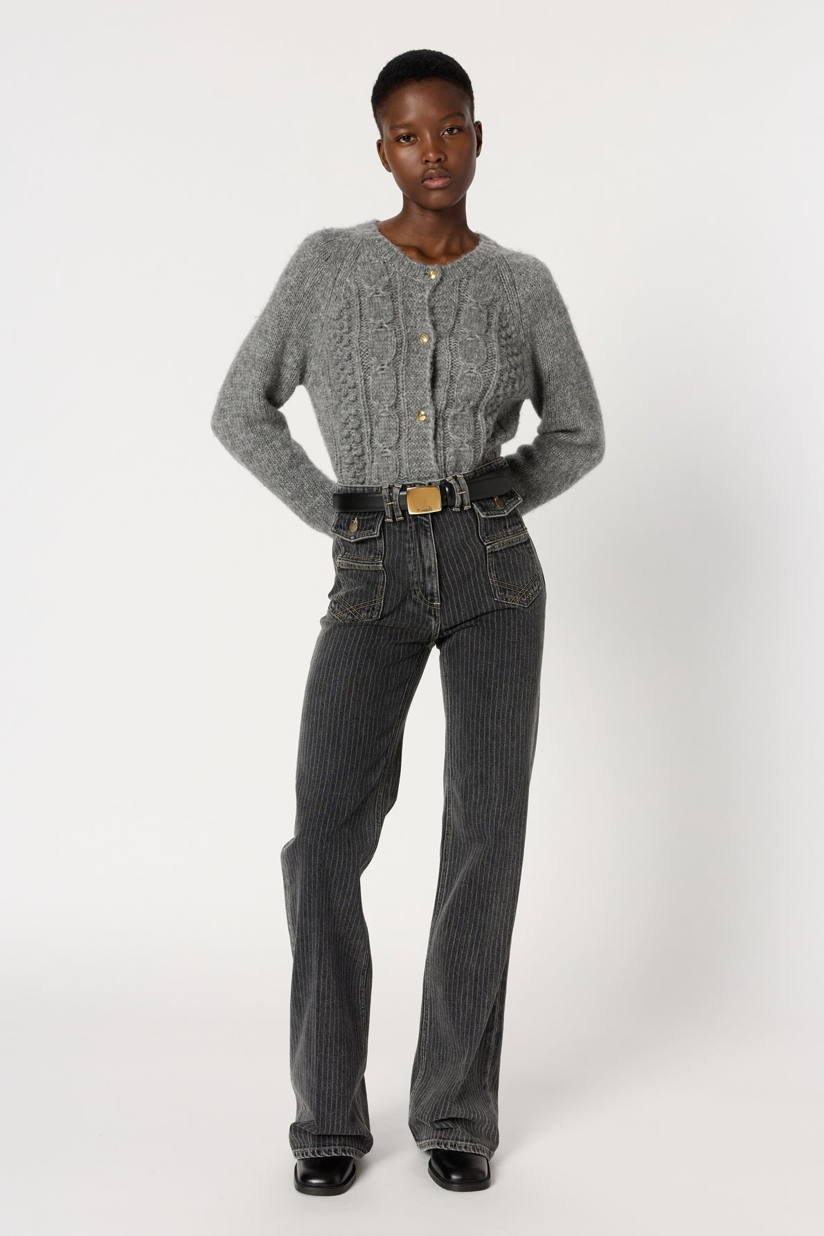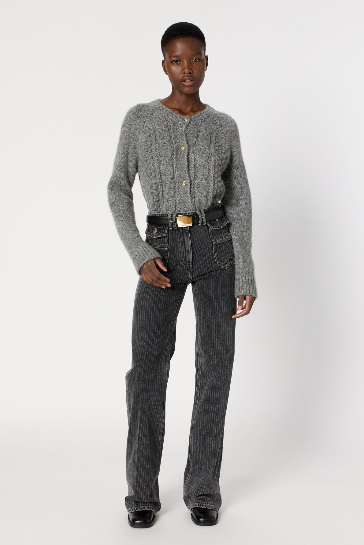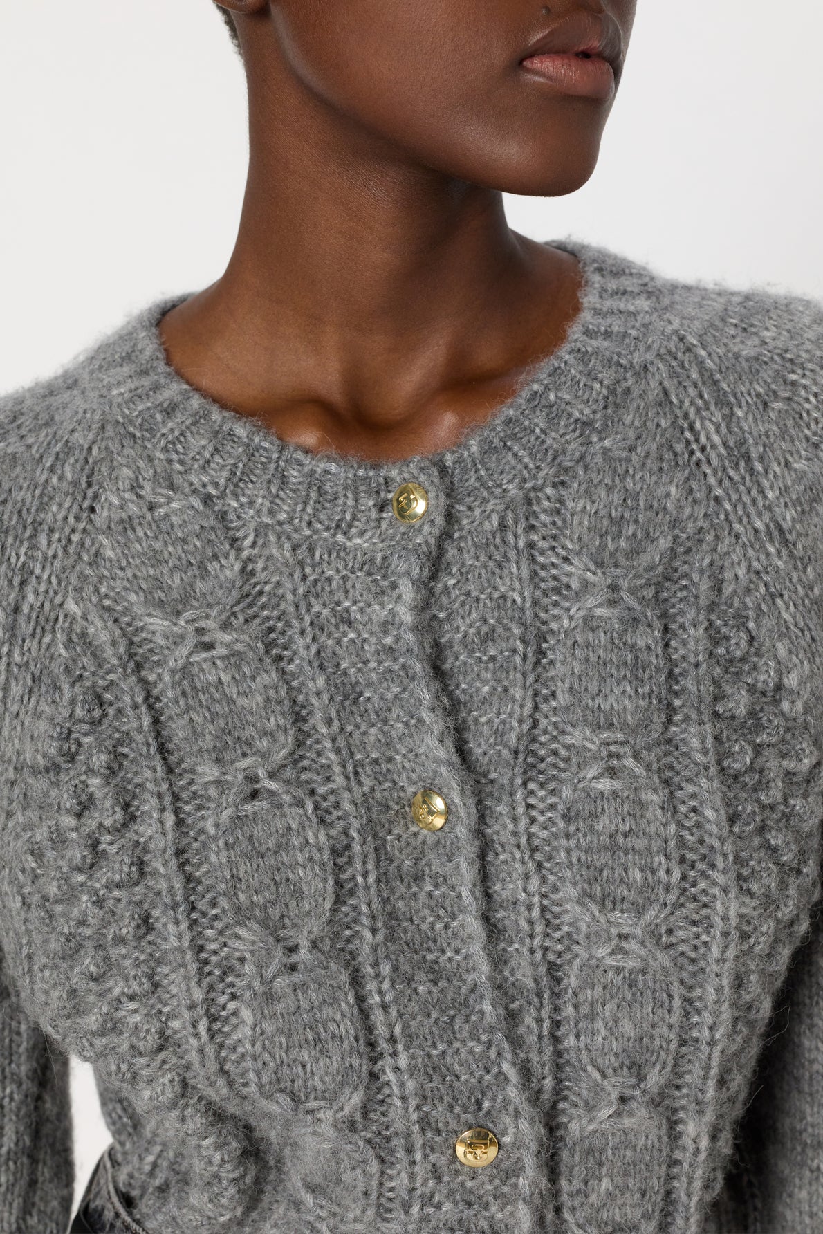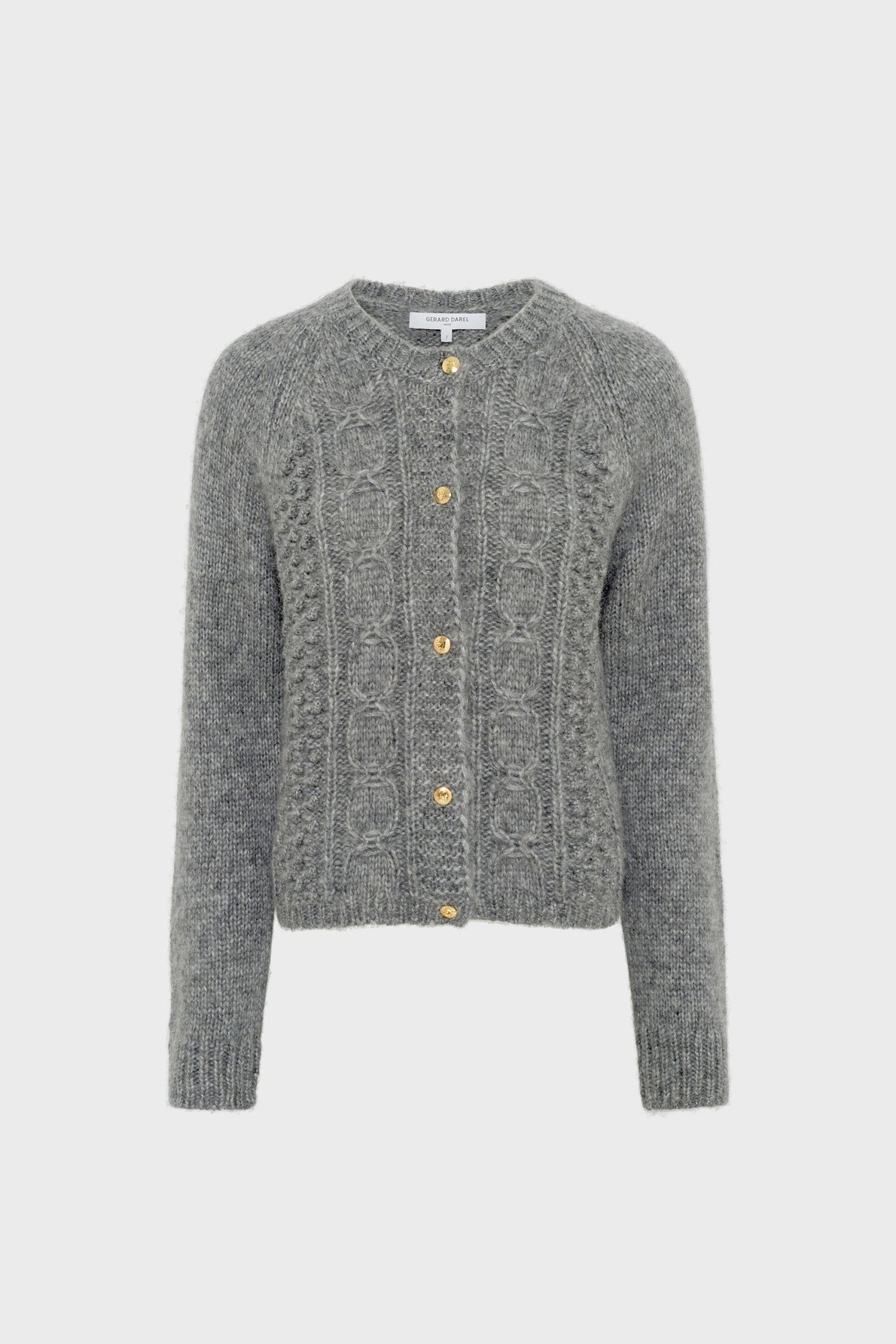 Malha de corte reto, mangas raglan, decote redondo, aperta com botões dourados.