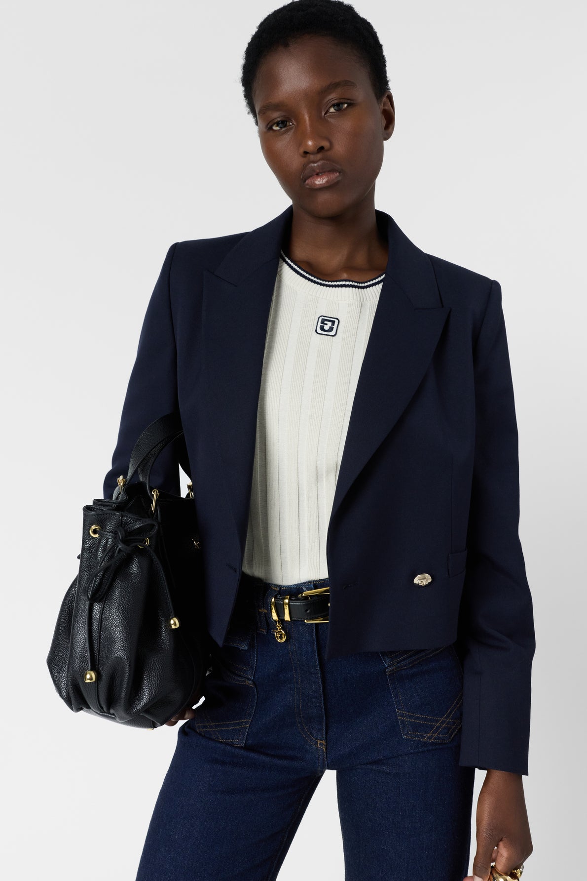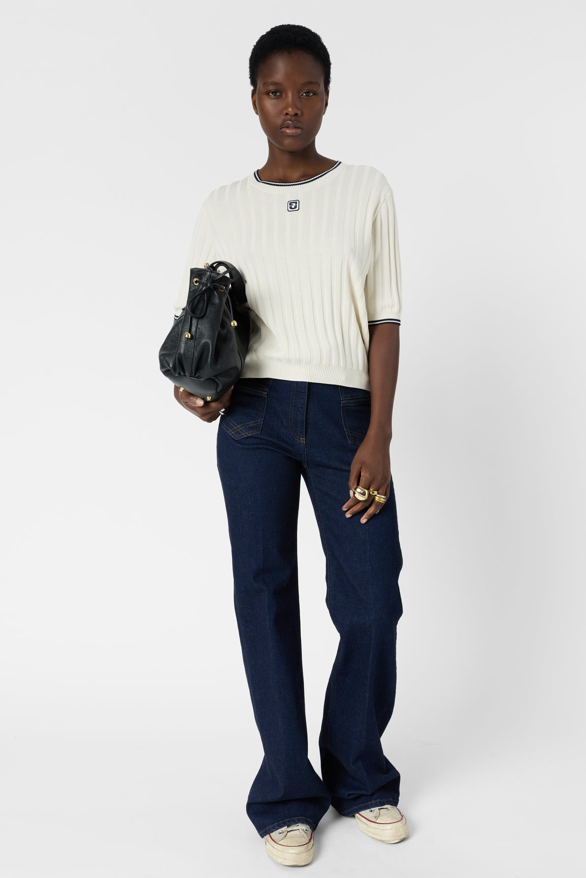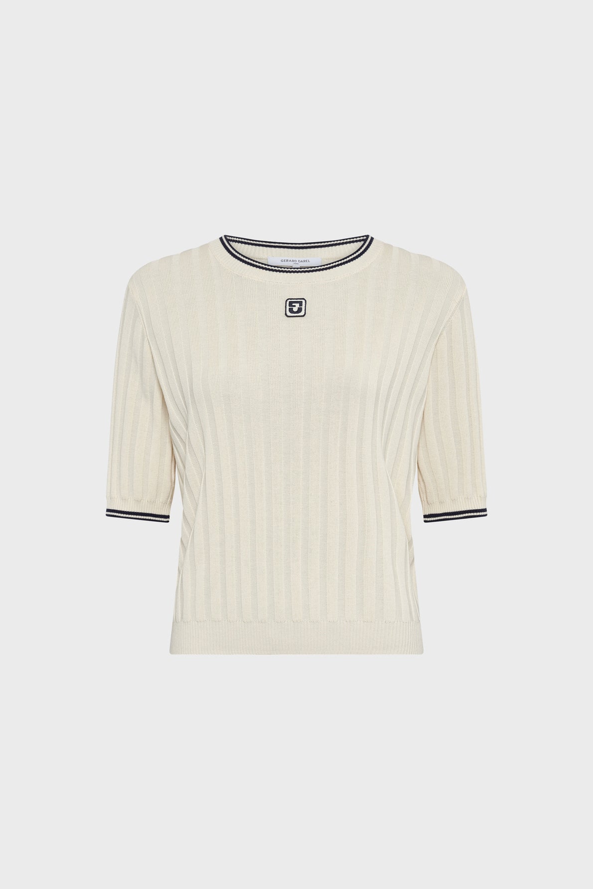 Malha canelada de corte reto, decote redondo e mangas curtas.