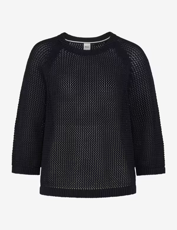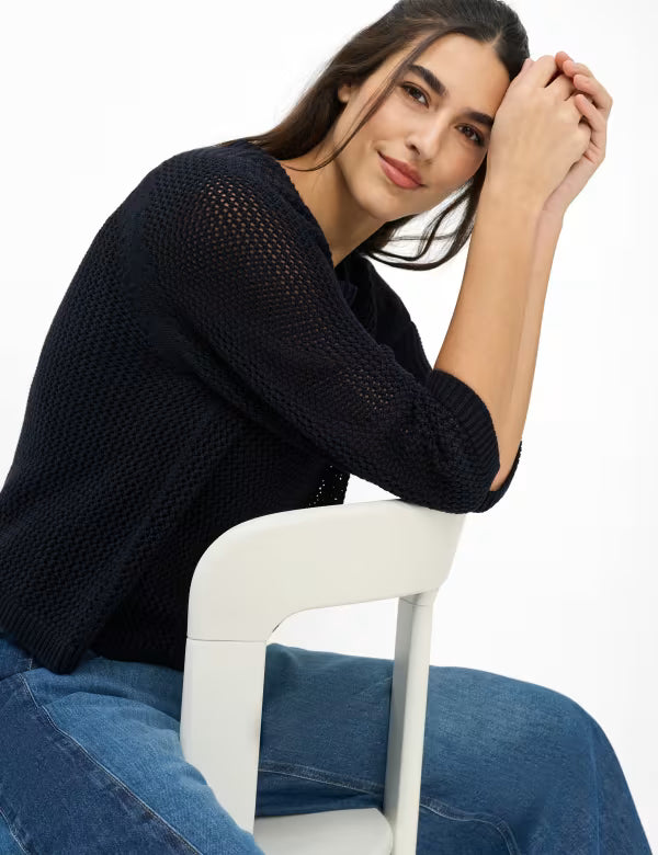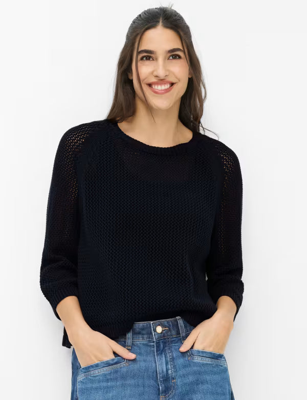 Malha de corte reto, decote redondo, mangas raglan e à 3/4 .