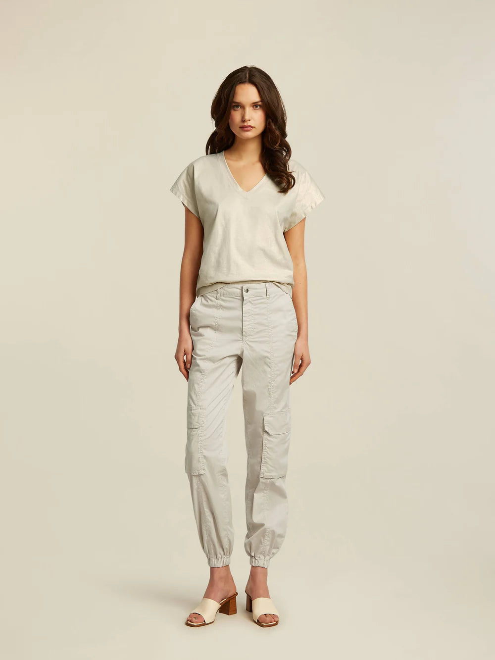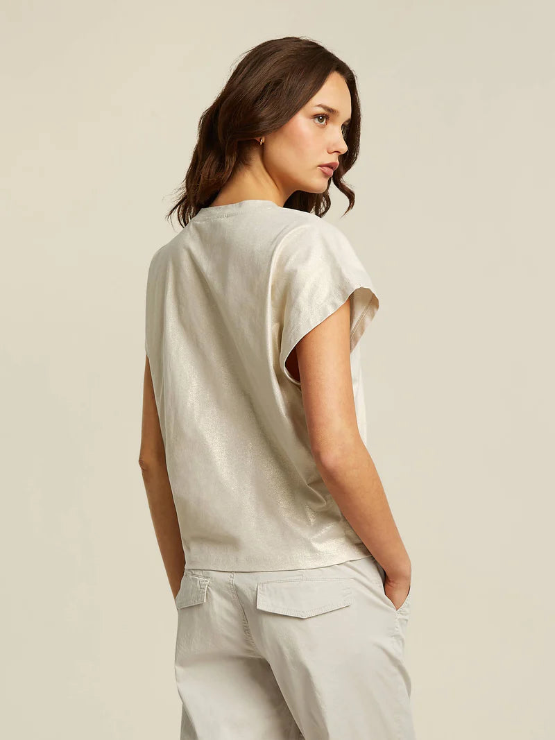 T-shirt em jersey de algodão, decote em V e ombros descaídos em forma de manga.