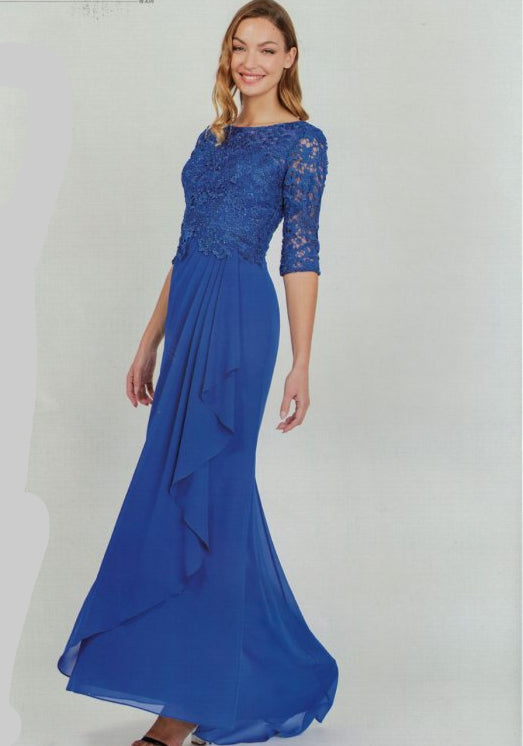 Vestido longo fluído, corpo em renda, decote redondo e manga em renda 3/4, saia com pormenor drapeado na frente .