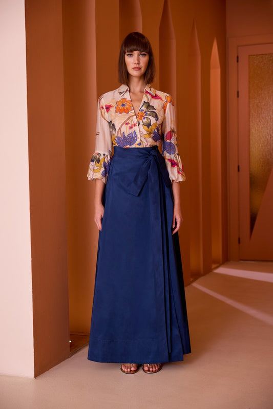 Vestido longo e fluído em cetim, decote caixa na frente e costas em V, sem mangas, completa-se com uma capa curta.