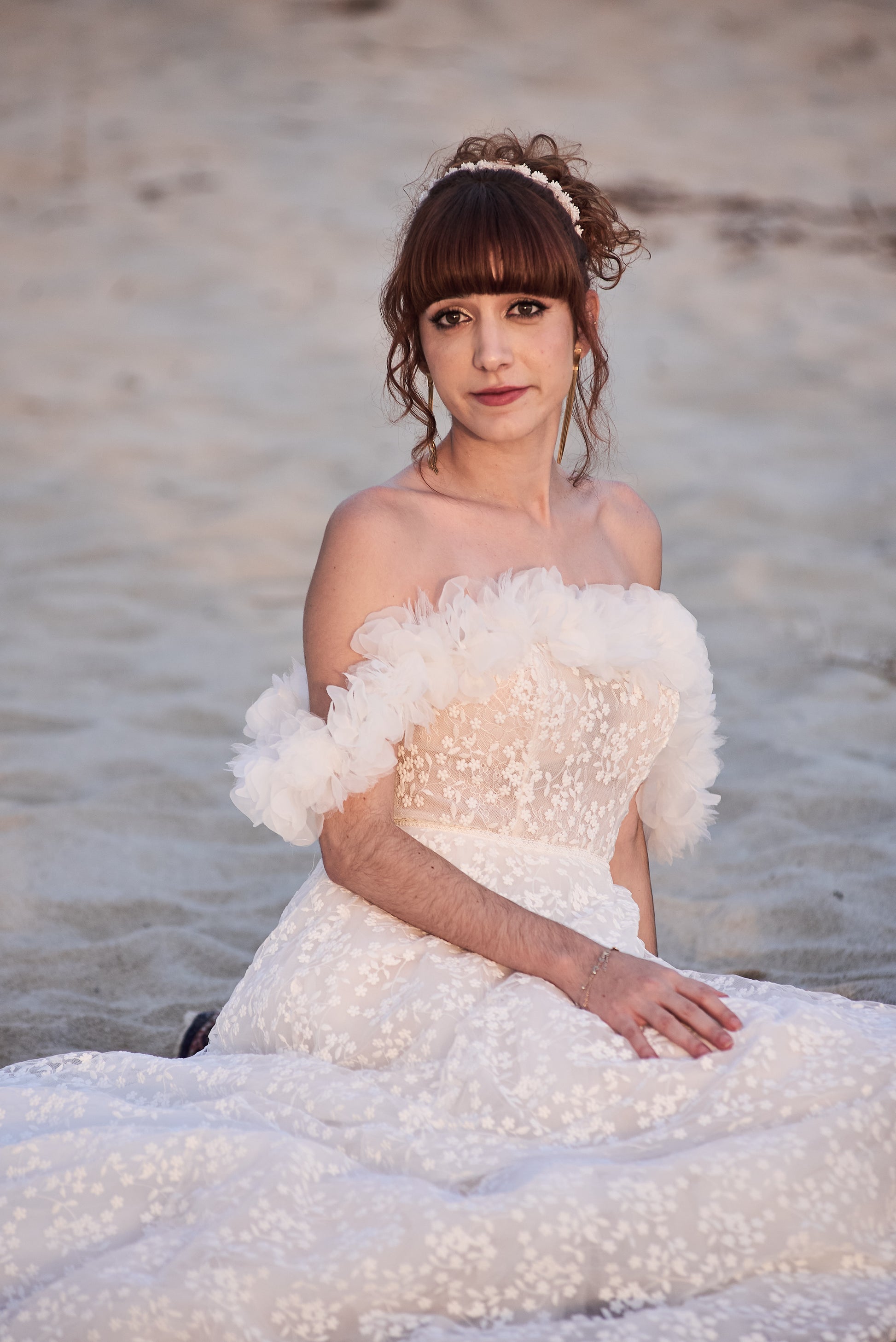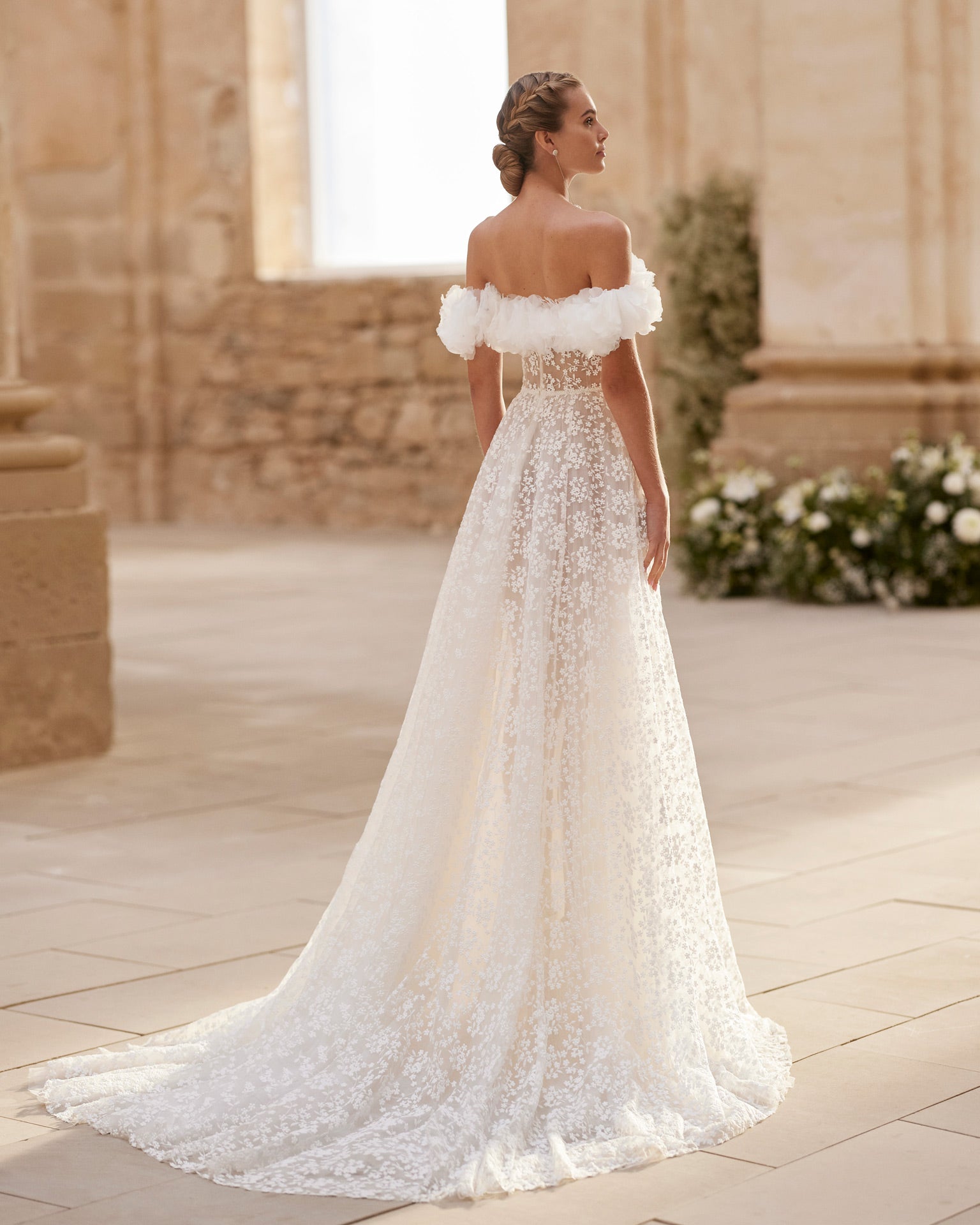 Vestido de noiva comprido, com silhueta em linha A, estilo romântico, confecionado em renda, com decote e ombros descobertos e manga descaída.