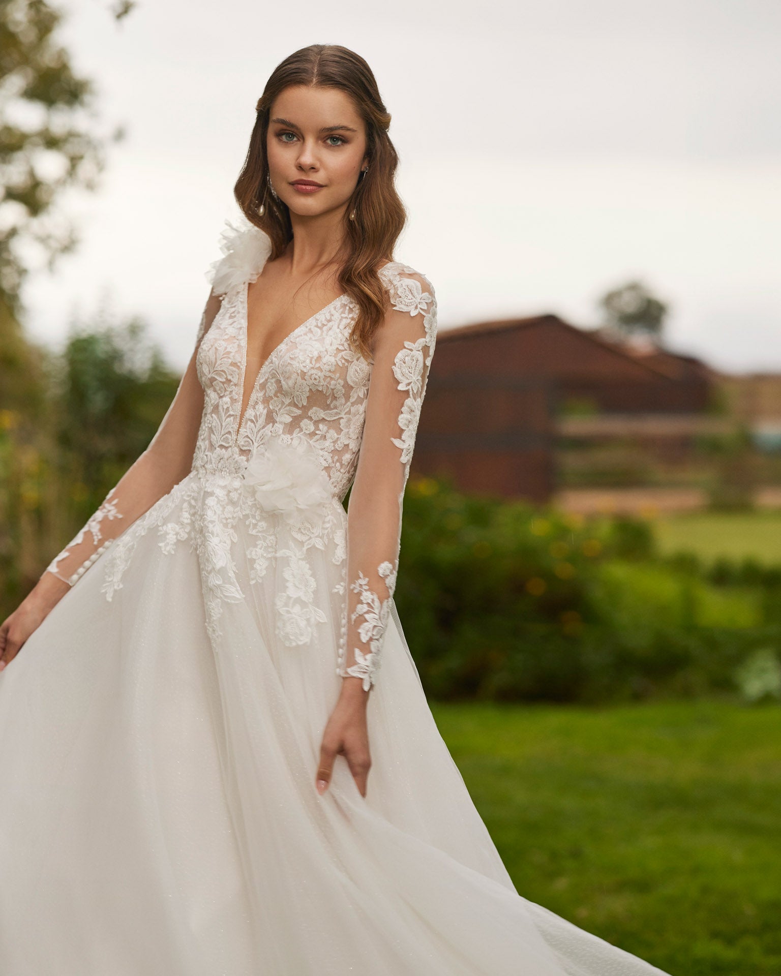 Vestido de corte em A, em tule e renda com adornos florais, decote em V à frente, mangas amovíbeis , o que lhe confere versatilidade, costas tattoo .