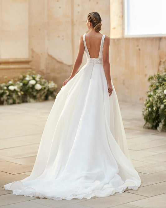 Vestido romântico, com saia fluída em georgette e tule plumetti, com cauda.