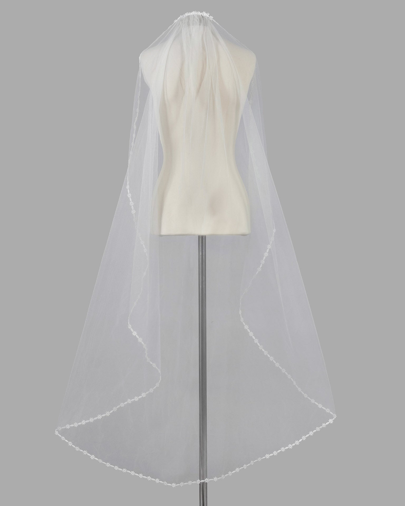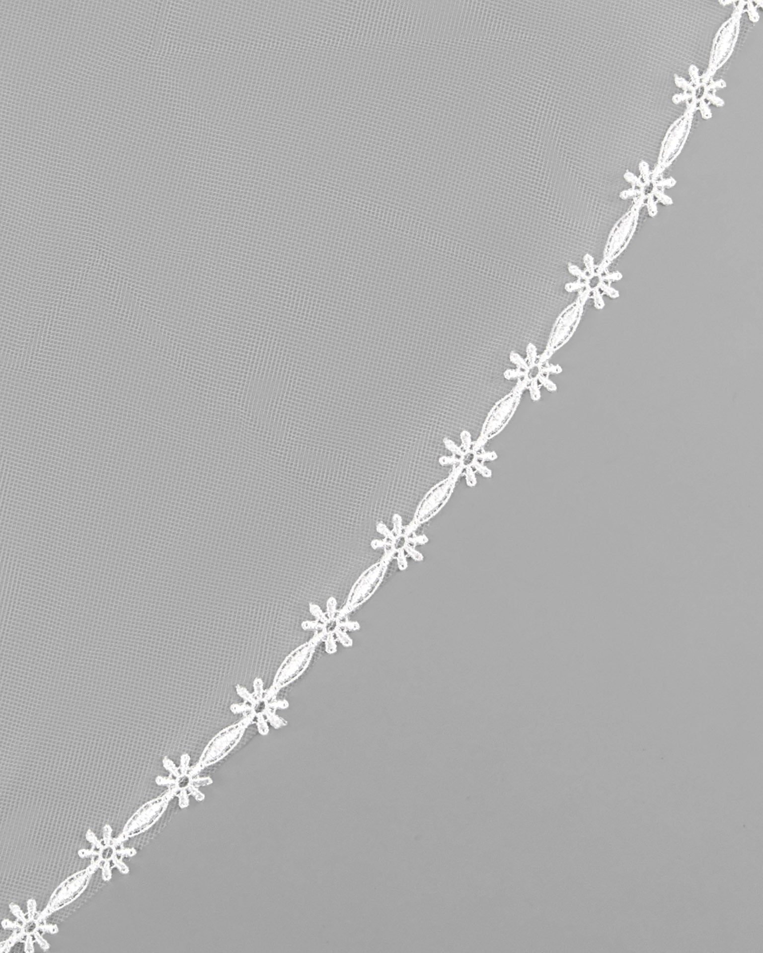 Véu em tule de seda, com pormenor de flor em toda a volta.
